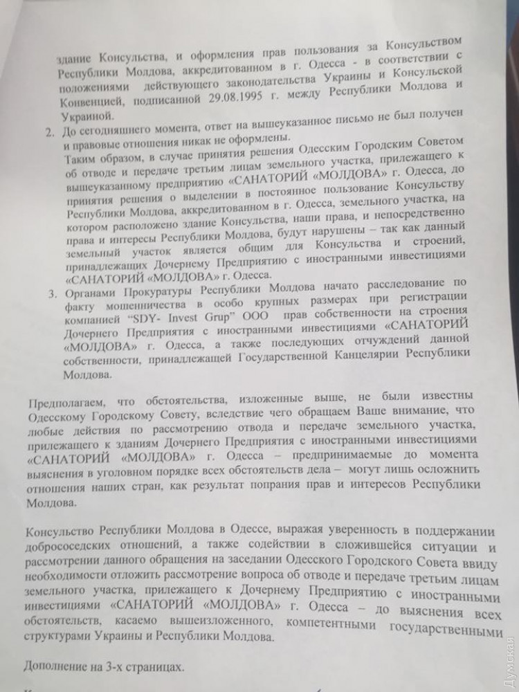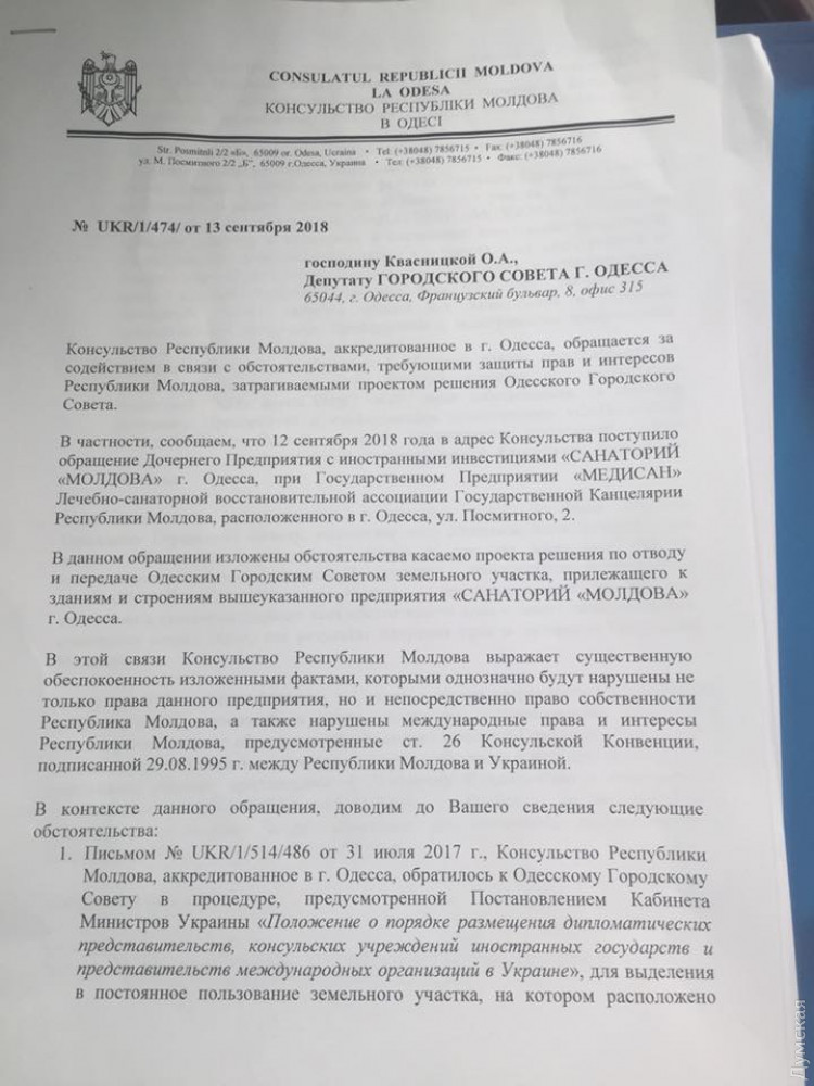 Молдавские дипломаты призвали Одесский горсовет не отводить землю под санаторием в АркадииСкандальные земельные решения выносят на предстоящую сессию Одесского горсовета, которая запланирована на 19 сентября. Как сообщила депутат Ольга Квасницкая, в повестку дня включают вопрос об отводе земли по адресу Посмитного, 2, где расположен санаторий «Молдова». С просьбой остановить легализацию кражи земли к депутату обратились из Консульства Республики Молдова в Одессе. «Консульство Республики Молдова выражает существенную обеспокоенность изложенными фактами, которыми однозначно будут нарушены права не только данного предприятия, но и непосредственно права собственности Республики Молдова, а также международные права и интересы Республики Молдова, предусмотренные ст. 26 Консульской Конвенции, подписанной 29.08.1995 года между Республикой Молдова и Украиной», — говорится в письме. Дипломаты также обратились с письмом к Одесскому городскому совету, сообщая, что данный земельный участок является общим для Консульства и строений, принадлежащих Дочернему предприятию с иностранными инвестициями «Санаторий Молдова». Напомним, земельная комиссия горсовета согласовала отвод земельного участка, на котором располагается санаторий «Молдова», в пользу фирмы «Сенвилиа-инвест Украина», зарегистрированной три месяца назад на Кипре и имеющей уставный фонд в размере 5000 гривен. СМЕРТЬ РОСІЙСЬКИМ ОКУПАНТАМ! Помітили помилку? Виділяйте слова з помилкою та натискайте control-enter |