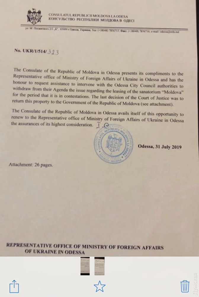 Консул Республики Молдова в Одессе направил в Министерство иностранных дел Украины обращение с просьбой повлиять на Одесский горсовет, чтобы тот отложил рассмотрение вопроса по передаче в аренду частной компании земельного участка санатория «Молдова». Этот документ зачитала на сегодняшней сессии горсовета депутат Ольга Квасницкая. «В настоящий момент Молдова добивается восстановления своих прав на эту здравницу в судах, планирует вернуть имущественный комплекс в собственность государства», — отметила Ольга Квасницкая и предложила снять с повестки дня соответствующий вопрос. Напомним, имущественный комплекс «Молдовы» ранее был выкуплен компанией «Макстгруп», которая сейчас добивается оформления земли под санаторием. Ранее «Думская» уже публиковала эскизы того, что фирма планирует построить на месте здравницы. От «Молдовы» она планирует оставить только исторический главный корпус, выходящий фасадной частью на пересечение Посмитного и Генуэзской. На остальной территории появится четыре многоэтажных дома. Исчезнет и уникальный бассейн с морской водой. СМЕРТЬ РОСІЙСЬКИМ ОКУПАНТАМ! Помітили помилку? Виділяйте слова з помилкою та натискайте control-enter |