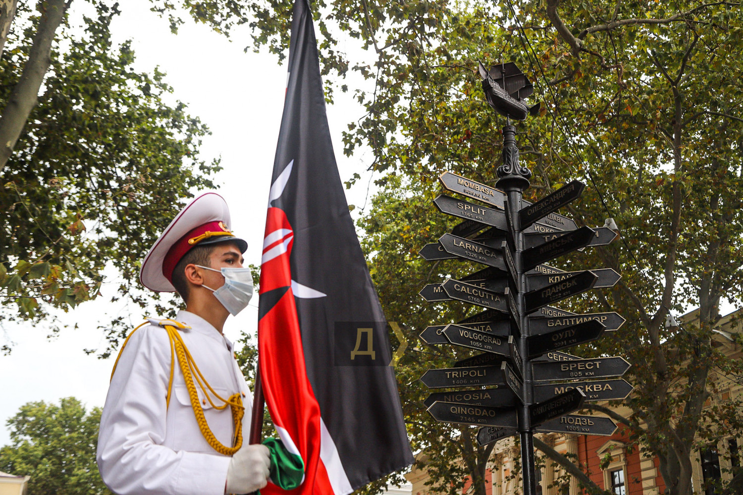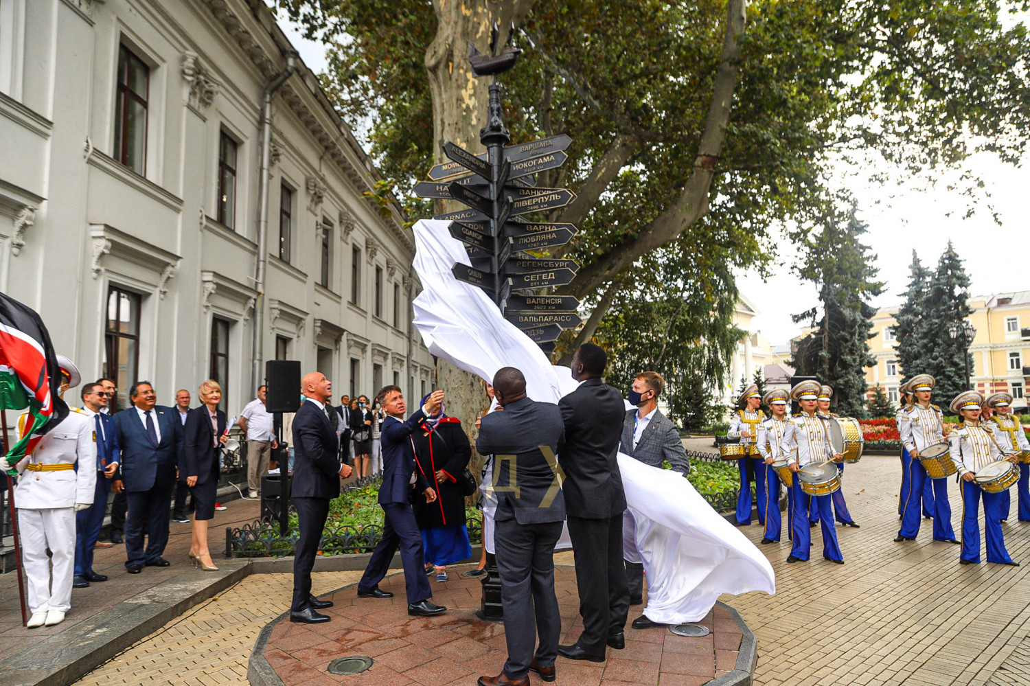 Указатель города Момбаса (Республика Кения), с которым Одесса в нынешнем году подписала договор о сотрудничестве в сфере экономики, туризма, образования и культуры открыли сегодня у здания мэрии.