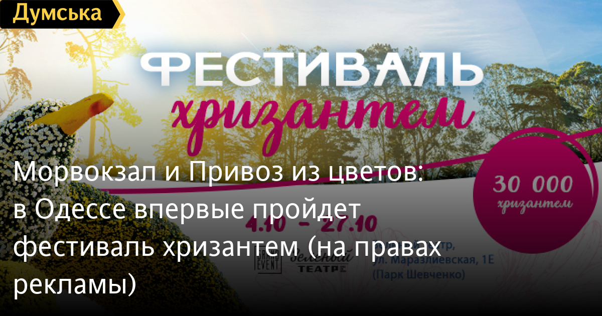 Морвокзал и Привоз из цветов: в Одессе впервые пройдет фестиваль хризантем (на правах рекламы)4 октября в Зеленом театре стартует Фестиваль хризантем, на котором гости увидят главные достопримечательности Одессы в виде цветочных инсталляций. Более тридцати масштабных и объемных фигур из цветов до пяти метров в высоту, среди которых Морвокзал, Привоз, Оперетта, памятник «Одесское время», Воронцовский маяк и многое другое. «Можно сказать, что это Одесса в миниатюре — все туристические локации города на одной площадке. Мы использовали более 30 тысяч хризантем, которые были выращены в теплицах специально для выставки. Верю, что фестиваль удивит жителей и гостей города», — рассказал Денис Погорелко, организатор мероприятия и руководитель компании Grand Event. В Одессе фестиваль такого формата и масштаба будет проходить впервые. Кроме цветочных инсталляций, организаторы обещают посетителям интересную развлекательную программу — популярные саундтреки и кавер хиты на саксофоне, живые скульптуры, мастер классы по сальсе и бачате, а также интерактив для детей. Фестиваль будет работать в Зеленом театре 4-27 октября с 10:00 до 20:00 без выходных. Стоимость входных билетов: взрослый 100 грн; для детей (7-14 лет) и пенсионеров 50 грн; детям до 7 лет - бесплатно. СМЕРТЬ РОССИЙСКИМ ОККУПАНТАМ! Заметили ошибку? Выделяйте слова с ошибкой и нажимайте control-enter |
