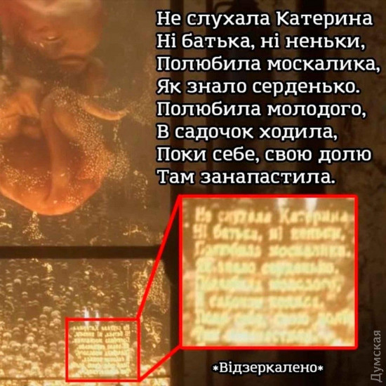 Отметим, что стихотворение Шевченко «Катерина» начинается со следующих строк: «Кохайтеся, чорнобриві, Та не з москалями, Бо москалі — чужі люде, Роблять лихо з вами».