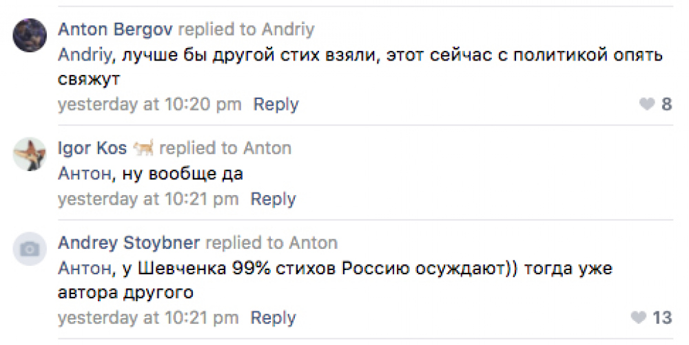 Дуже хотілося б, аби дописувачі, насамперед радикальних переконань, навчилися не тільки слухати, але й чути. Абсолютно правий Віктор Вікторович зі своїм твердженням, що в шевченківські часи москалями називали не тільки росіян, а й солдатів. Тоді служили по 25 років і армійська (російська) мова ставала звичною і вживаною для всіх вояків, незалежно від національності. «Кохайтеся, чорнобриві, та не з москалями