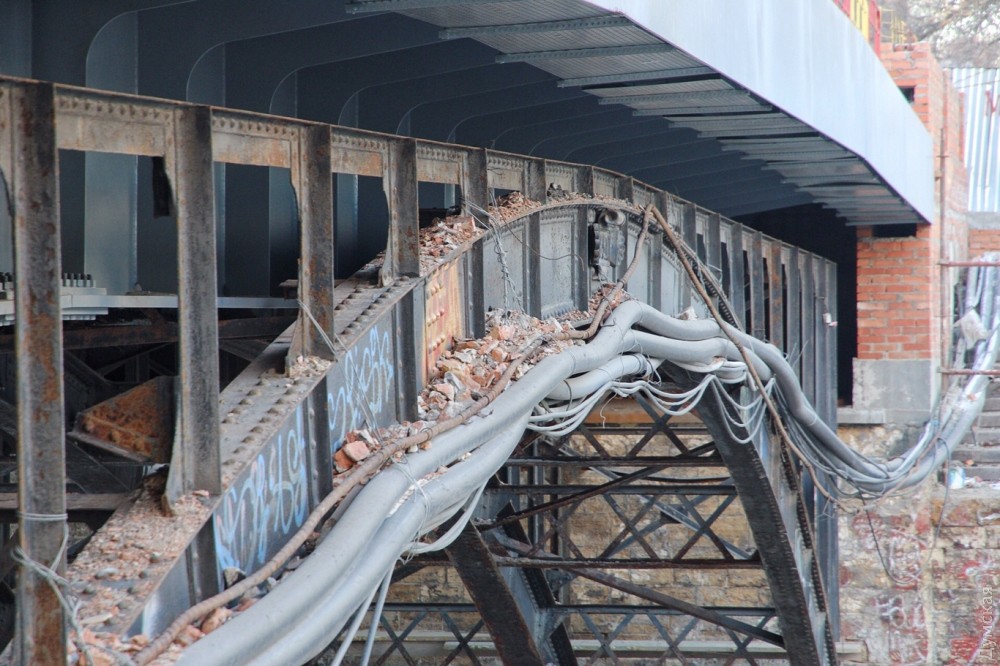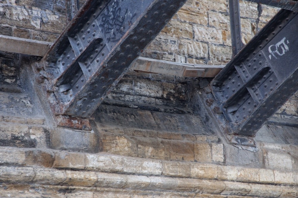 По сути мост полностью заменили, оставив старые клепаные фермы в качестве бутафории. Тело оста поддерживают новые металлические балки.