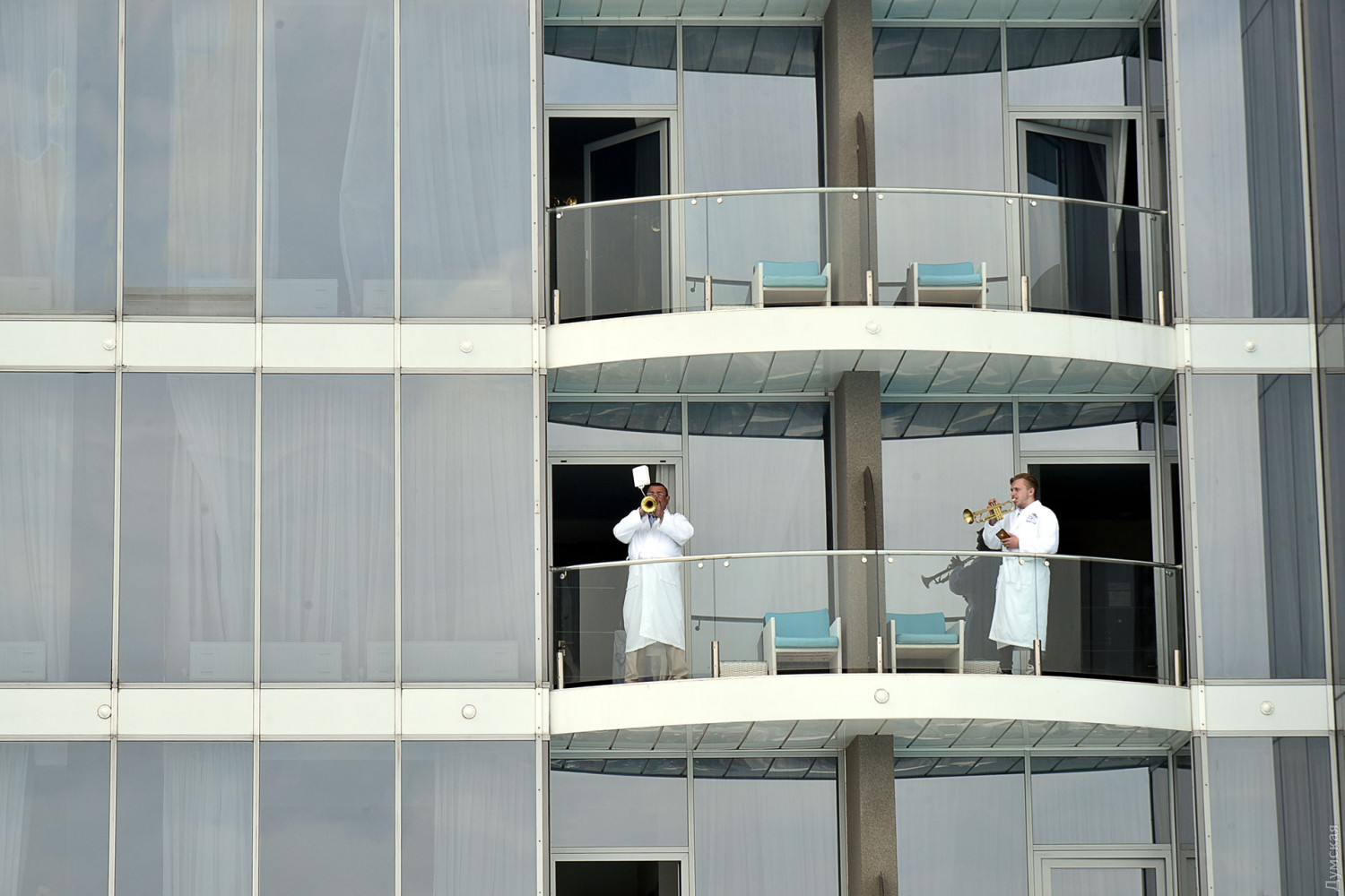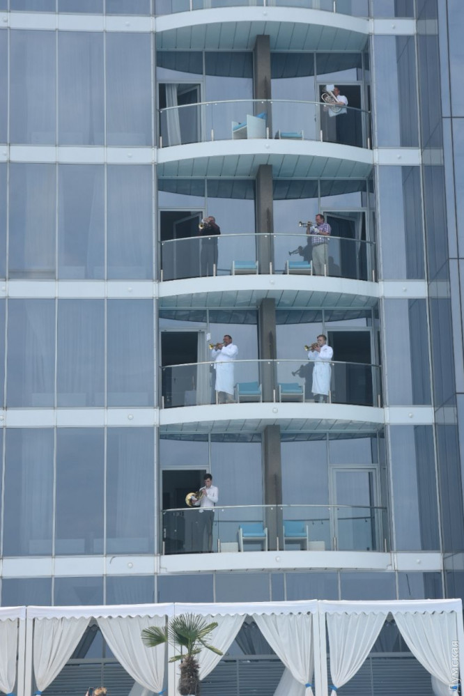 Необычный флешмоб устроил оркестр Одесского муниципального театра духовой музыки имени Салика. Вчера днем под видом постояльцев отеля «Немо» на Ланжероне музыканты вышли на балконы и, к удивлению отдыхающих, начали одновременно играть. Оркестр исполнил композицию St. Louis Blues, написанную в 1914 году, а также мелодию «Ах, Одесса!». Музыканты и дирижер находились на разных этажах, на расстоянии друг от друга, но сыграли слаженно, за что получили заслуженные аплодисменты. Затем оркестр спустился на набережную Ланжерона, где исполнил еще несколько композиций. Управляющий отельным комплексом «Немо» Фазиль Аскеров, который принимал участие в организации флешмоба, сообщил, что акция приурочена к Международному дню джаза и призвана поддержать имидж Одессы в качестве культурной столицы юга Украины. Фото — Максим Пшибышевский СМЕРТЬ РОСІЙСЬКИМ ОКУПАНТАМ! Помітили помилку? Виділяйте слова з помилкою та натискайте control-enter |
