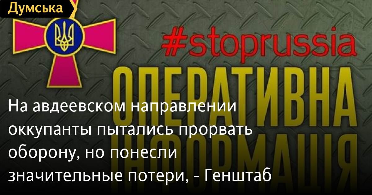 На авдіївському напрямку окупанти намагалися прорвати оборону, але зазнали значних втрат, — ГенштабПродовжується 164 доба героїчного протистояння української нації російському воєнному вторгненню. Як повідомляється в вечірньому зведенні Генштабу, на сіверському напрямку противник здійснив артилерійські обстріли неподалік Янжулівки, Миколаївки та Залізного Мосту Чернігівської області, а також біля Нової Гути, що на Сумщині. На харківському напрямку ворог задіяв ствольну та реактивну артилерію для обстрілів районів Прудянки, Дуванки, Золочева та ще 27 населених пунктів. Завдав авіаційних ударів біля Верхнього Салтова, Леб’яжого та Гусарівки. На слов’янському напрямку противник здійснював вогневе ураження із ствольної та реактивної артилерії в районах населених пунктів Велика Комишуваха, Сулигівка, Довгеньке, Долина, Мазанівка, Адамівка, Карнаухівка, Курулька, Рідне, Дібрівне, Грушуваха, Богородичне та Маяк. Окремі підрозділи ворога намагалися просунутися в район західної околиці Богородичного, успіху не мали, відійшли. На краматорському напрямку противник здійснив обстріли із танків та артилерії поблизу Сіверська, Серебрянки, Верхньокам’янського, Дронівки, Донецького, Григорівки, Різниківки, Миколаївки, Спірного, Званівки, Переїзного, Калеників, Долини та Виїмки. На бахмутському напрямку зафіксовано ворожі обстріли поблизу Бахмута, Соледара, Зайцевого, Яковлівки, Кодеми, Юріївки, Бахмутського, Берестового, Покровського та Іванграда. Російська штурмова та армійська авіація завдала ударів неподалік Зайцевого, Соледара, Бахмута, Берестового і Яковлівки. Штурмовими діями окупанти намагалися покращити тактичне положення в напрямках Стряпівка – Бахмутське, Покровське – Соледар, Покровське – Бахмут, Володимирівка – Яковлівка, Відродження – Вершина, Покровське – Вершина. На всіх вказаних напрямках ворог отримав рішучу відсіч українських воїнів та відійшов. На авдіївському напрямку ствольна та реактивна артилерія ворога обстрілювала райони Авдіївки, Пісків, Нетайлового, Невельського та Нью-Йорка. Штурмова авіація окупантів діяла поблизу Нью-Йорка, Красногорівки, Пісків та Мар’їнки. Наступальними діями російські загарбники намагалися прорвати оборону наших військ у напрямках Спартак – Авдіївка, Веселе – Піски, Новоселівка Друга – Красногорівка, Олександрівка – Мар’їнка, Кирилівка – Павлівка та Пречистівка – Новомайорське. Українські воїни завдали ворогу значних втрат та відкинули назад. На новопавлівському та запорізькому напрямках противник здійснював обстріли біля Новомихайлівки, Шевченко, Великої Новосілки, Запоріжжя, Залізничного, Новоданилівки, Зеленого Поля та Чарівного. Завдав авіаударів в районах населених пунктів Темирівка, Малі Щербаки, Новоандріївка, Вільне Поле, Новосілка, Вугледар, Павлівка та Пречистівка. На південнобузькому напрямку противник намагається утримати зайняті позиції та не допустити створення Силами оборони сприятливих умов для відновлення наступу та звільнення тимчасово захопленої території. СМЕРТЬ РОСІЙСЬКИМ ОКУПАНТАМ! Помітили помилку? Виділяйте слова з помилкою та натискайте control-enter |