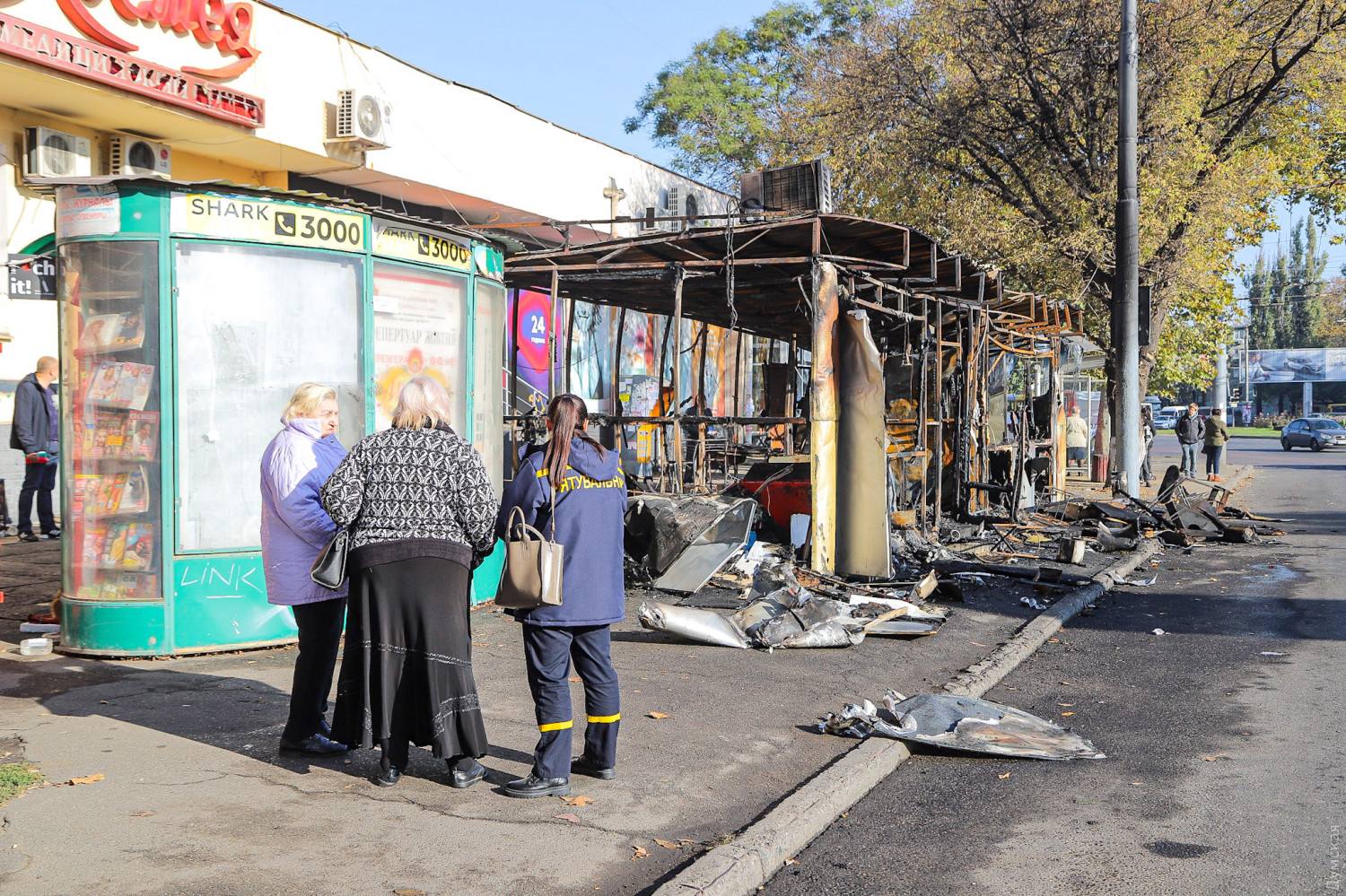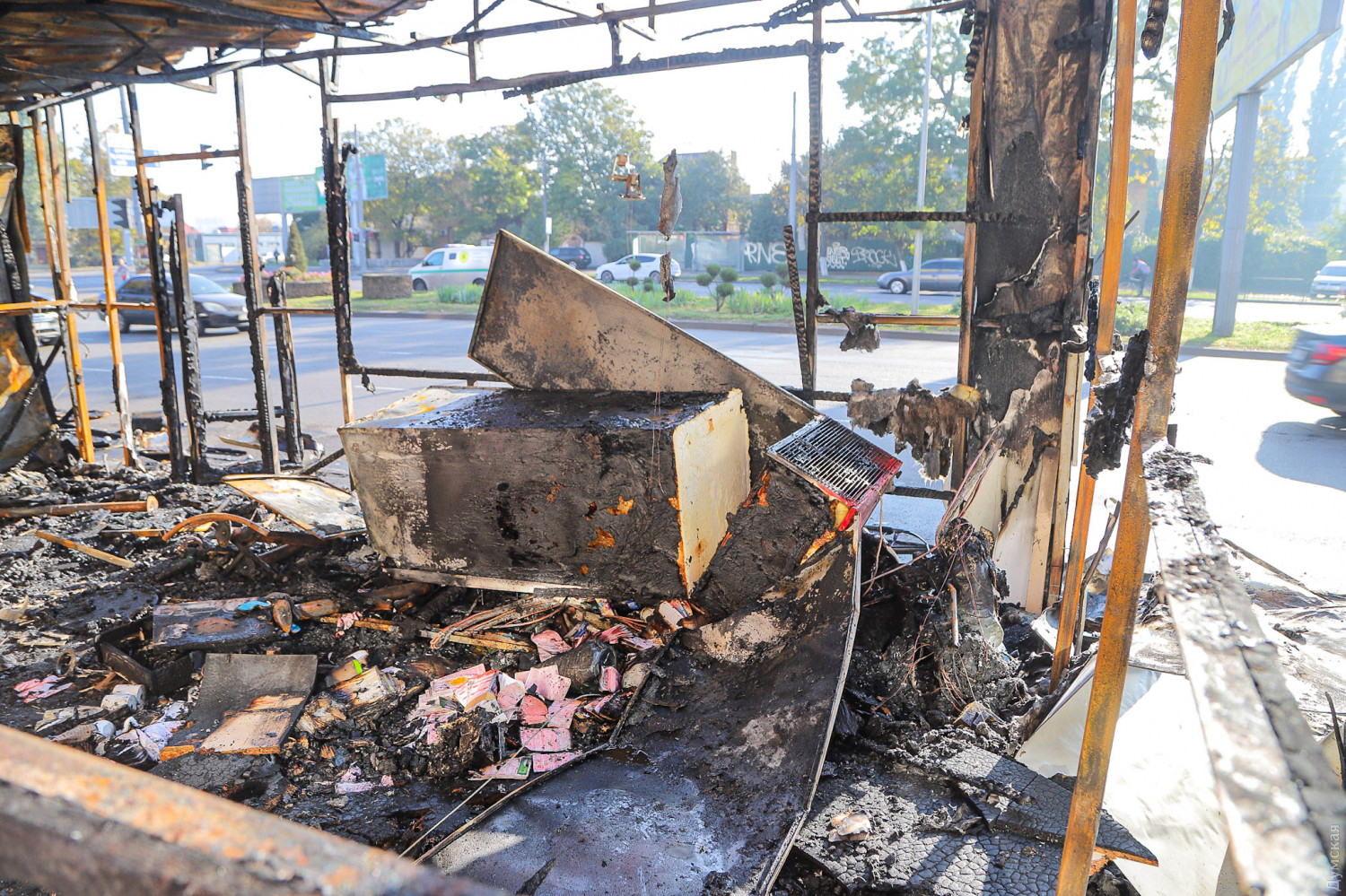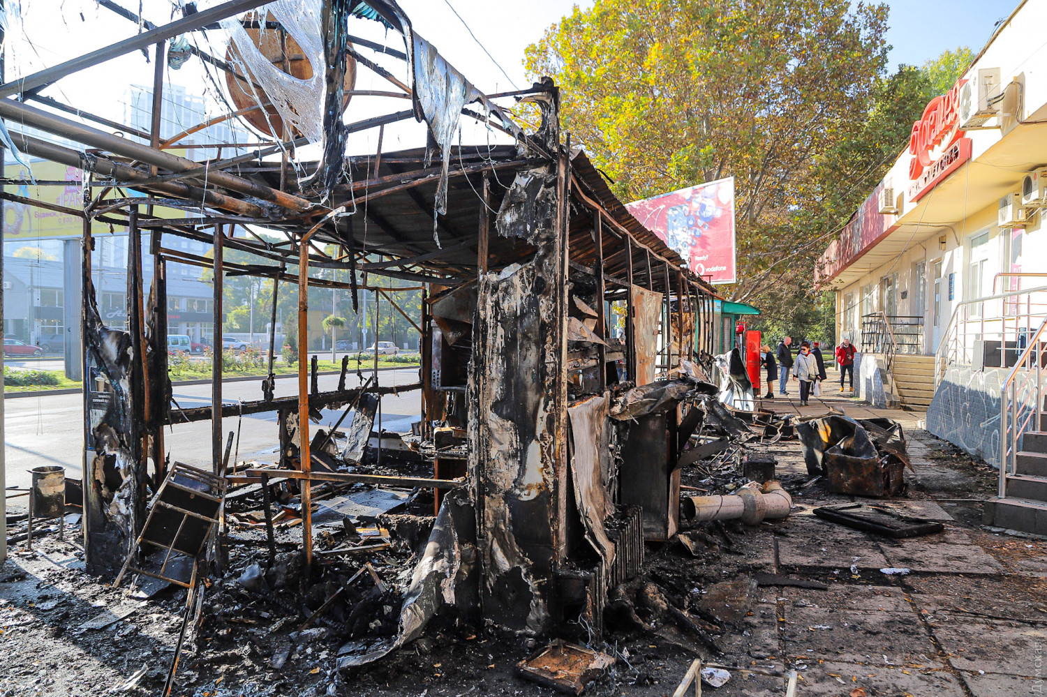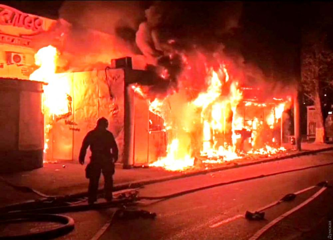 Как сообщает ГСЧС в Одесской области, в тушении пожара принимали участие 10 спасателей и две единицы спецтехники. Причины возгорания устанавливаются. Как сообщает наш корреспондент, побывавший утром на месте пожарища, огонь полностью уничтожил два павильона — шаурму и неработавшее «лото», а также повредил расположенный почти впритык газетный киоск. Кроме того, от пламени повреждены стекла и вывеска магазина на первом этаже расположенного за остановкой здания.