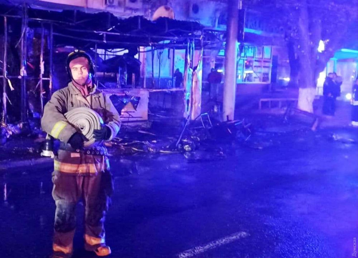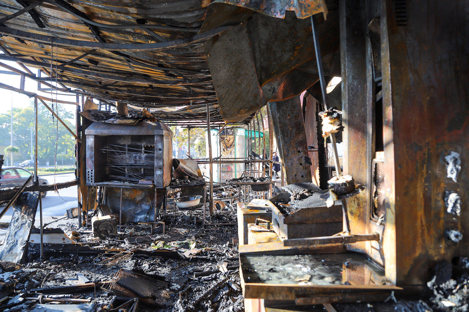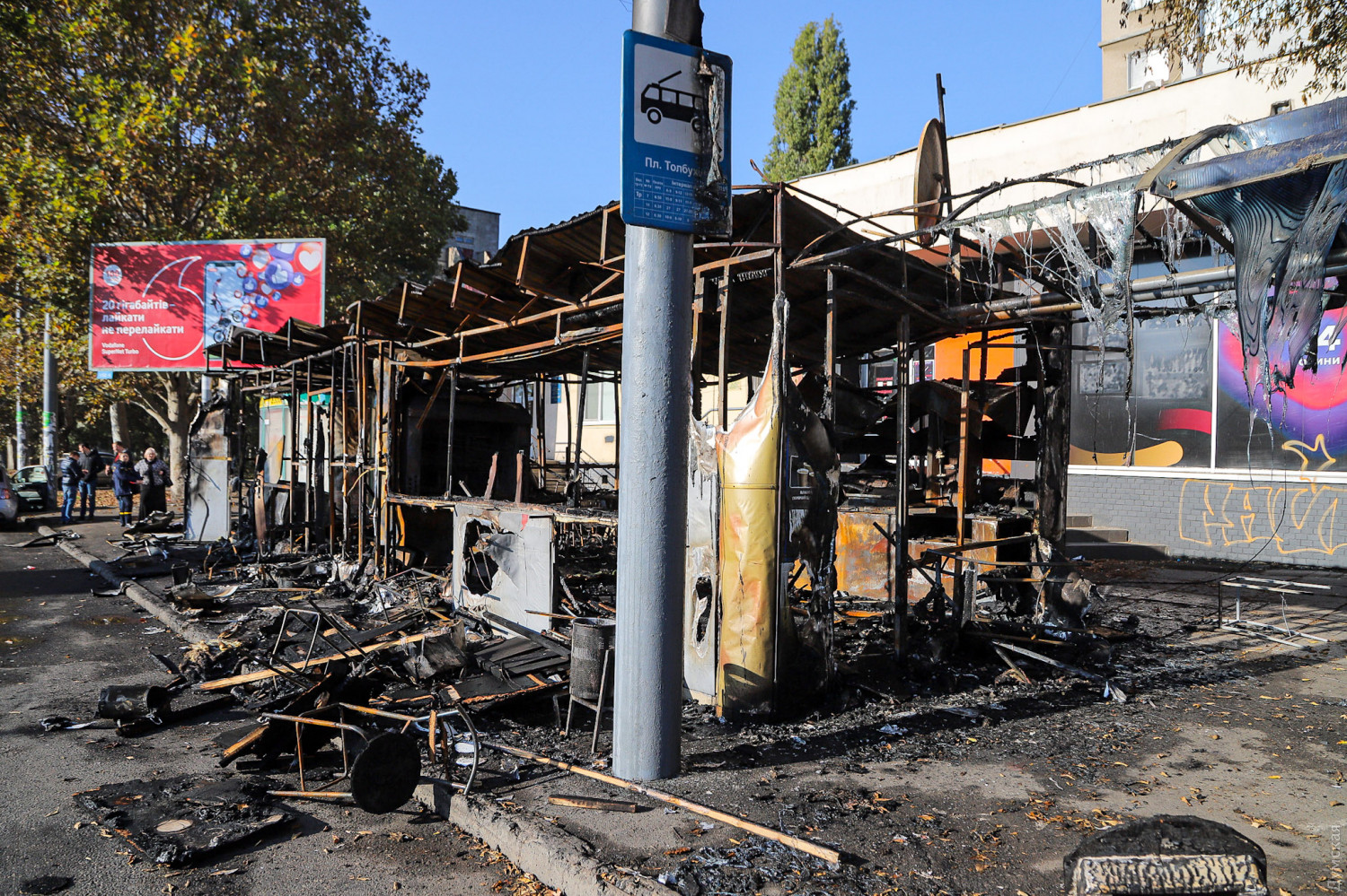 Как сообщает ГСЧС в Одесской области, в тушении пожара принимали участие 10 спасателей и две единицы спецтехники. Причины возгорания устанавливаются. Как сообщает наш корреспондент, побывавший утром на месте пожарища, огонь полностью уничтожил два павильона — шаурму и неработавшее «лото», а также повредил расположенный почти впритык газетный киоск. Кроме того, от пламени повреждены стекла и вывеска магазина на первом этаже расположенного за остановкой здания.