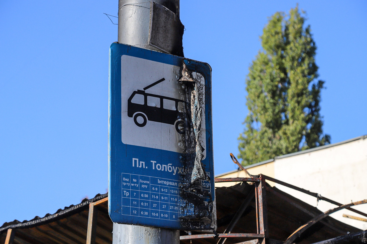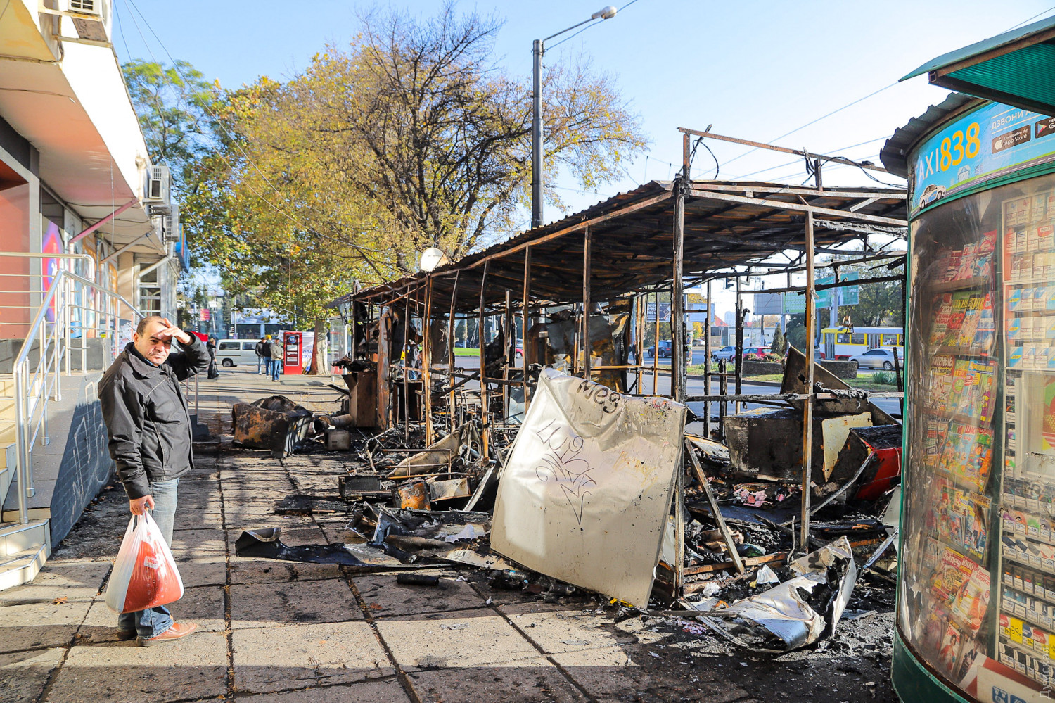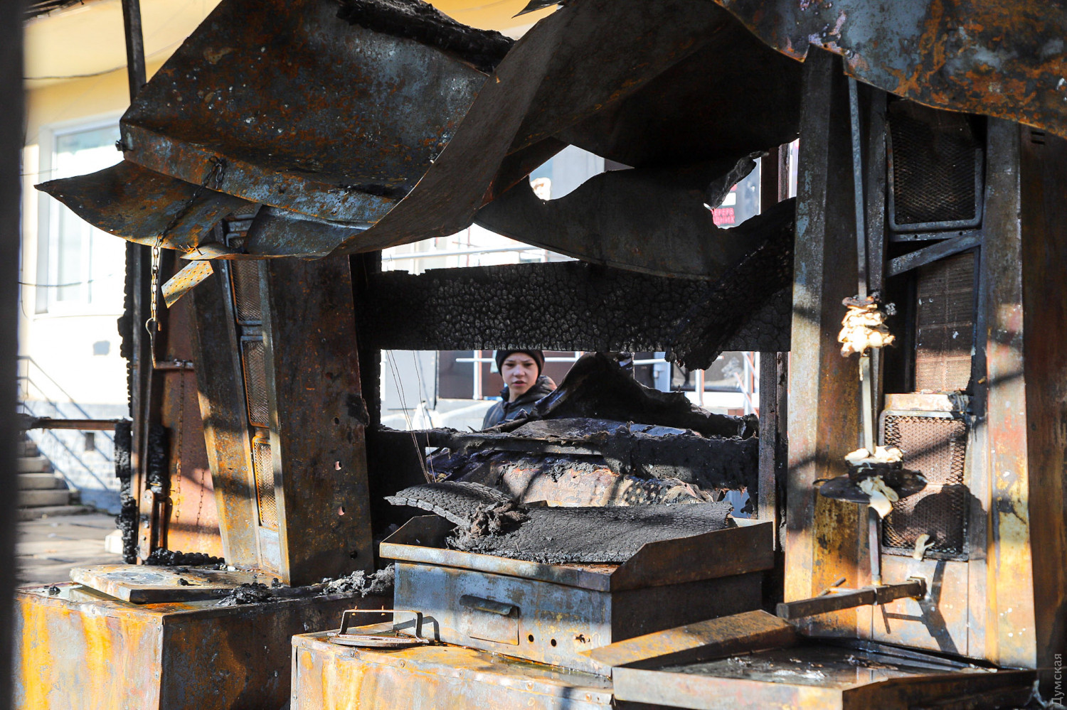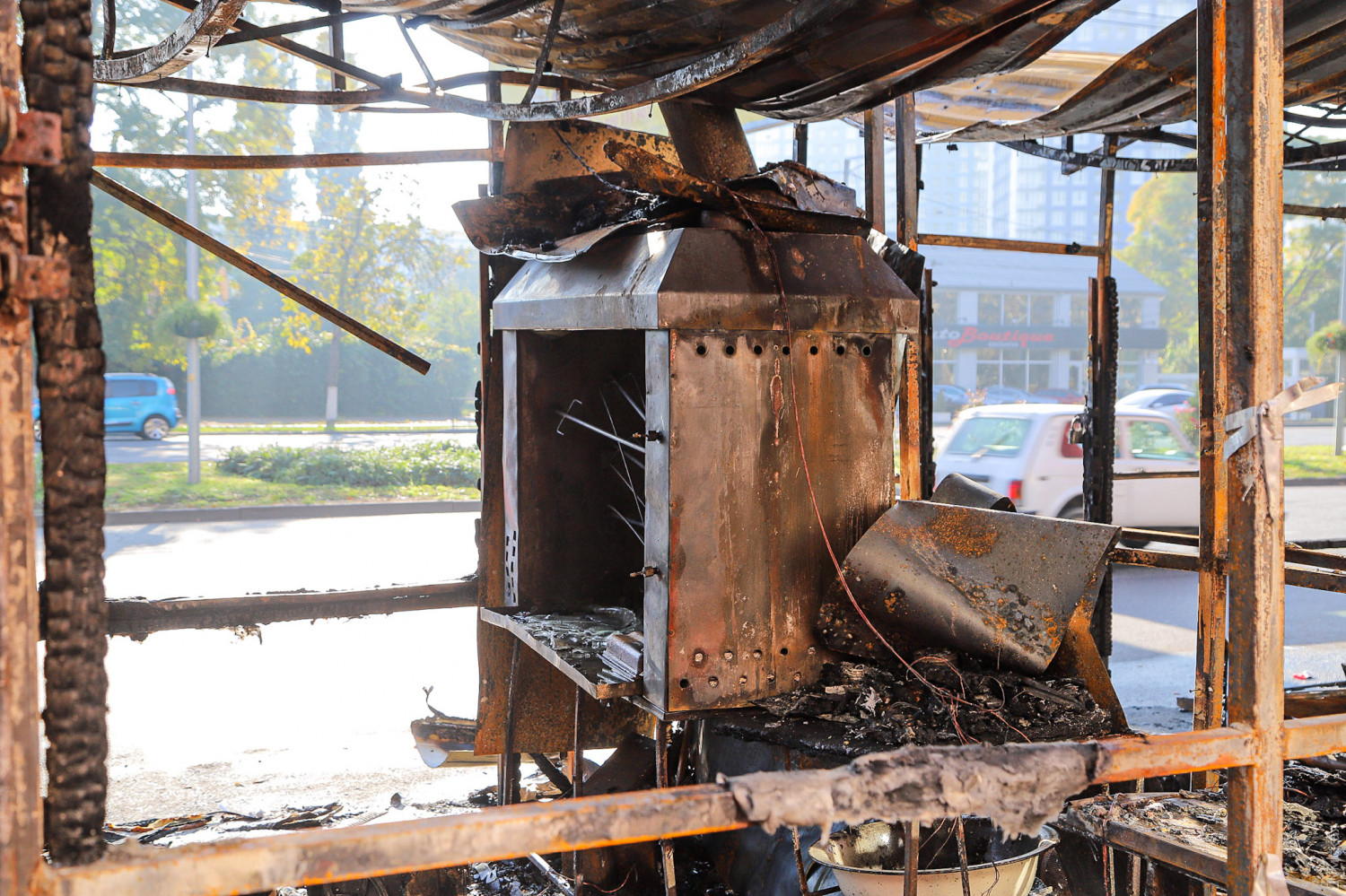 Как сообщает ГСЧС в Одесской области, в тушении пожара принимали участие 10 спасателей и две единицы спецтехники. Причины возгорания устанавливаются. Как сообщает наш корреспондент, побывавший утром на месте пожарища, огонь полностью уничтожил два павильона — шаурму и неработавшее «лото», а также повредил расположенный почти впритык газетный киоск. Кроме того, от пламени повреждены стекла и вывеска магазина на первом этаже расположенного за остановкой здания.