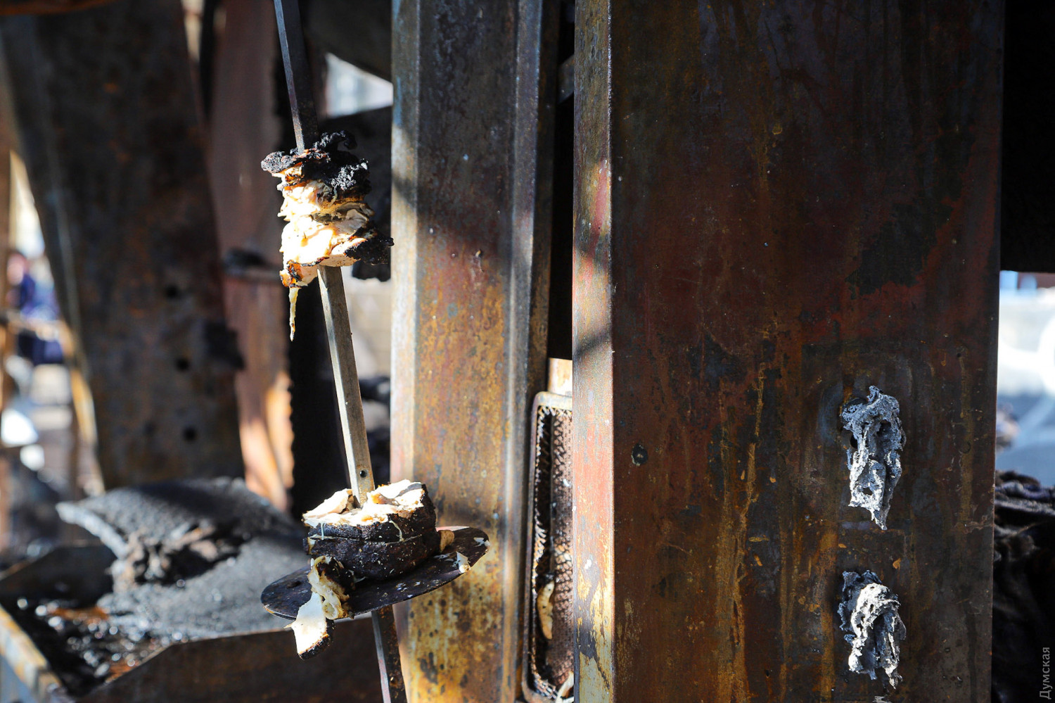 Интересно: на фото мы видим, что сырое мясо не снимается, не хранится в холодильнике, не обрабатывается оборудование для жарки после рабочей смены. То есть до следующего утра всё это подвергается воздействию микробов и бактерий. Приятного аппетита, одесситы и гости города!