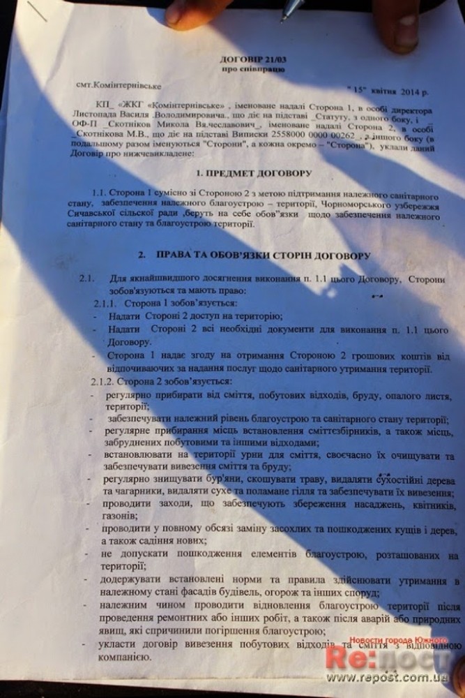 На территории дикого пляжа, известного южненцам как БРЛС (расположен вблизи береговой локационной станции), появился шлагбаум. Сотрудники нового «КПП» требуют оплату с автомобилистов за пребывание на территории пляжа: 10 гривен за день, 30 гривен за сутки. Бесплатно могут проезжать автомобили работников нефтетерминала «Південний», а также жителей сел Сычавка и Кошары, пишет «Rе:пост». Предприимчивые контролеры говорят, что действуют на основании решения сессии Сычавского сельсовета, которому принадлежит эта часть побережья.Журналистам показали копии документов, в ряду которых решение сельсовета, договор, заключенный с предпринимателем и карта, где отмечена территория, относящаясяк с. Сычавка. На вопрос, что входит в стоимость проезда, сказали, что плата предполагает уборку территории и работу двух туалетов. Уборка, по словам предпринимателей, проводилась перед установкой шлагбаума. В этом процессе участвовал экскаватор, который сгреб весь мусор к скале, чем расчистил площадку для машин. Заместитель директора коммунального районного предприятия Коминтерновского района Олег Ангелов сообщил, что данные действия законны и в ближайшее время на этой территории будет наведен идеальный порядок: «Принято решение сельским советом, для того, чтобы поддерживать эту территорию в чистоте, в санитарных условиях. Потому что каждый год природоохранная прокуратура пишет нам. Мы приняли решение для благоустройства вот этого куска — поставить шлагбаум, вывезти мусор, поставить душевые кабинки, туалет уже поставили, сделать, чтобы люди туда ездили, отдыхали, тратили деньги. Но для этого нужны большие средства. Финансирование не предусмотрено. Мы приняли решения поставить людей, тех, которые вложат свои деньги Мы вывезли две машины мусора, разровняли площадку, навели порядок, пока, не на пять, а на три с плюсом», — сказал он. Отдыхающие отмечают, что обещанной чистоты на территории нет - вокруг много битого стекла, мусора, детей к воде приходится носить на руках. Некоторые автомобилисты не соглашаются с платным проездом,оставляя автомобиль чуть выше «пляжной стоянки». Пока что предприниматели не установили торговых точек, но как сообщил замдиректора, этот вариант не исключается. Пребывающих на отдыхе, по словам организаторов, в будущем будут снабжать питьевой водой.Охрана территории, по словам установщиков шлагбаума, не предполагается. Также на пляже не присутствуют спасатели, а сами предприниматели не обладают полномочиями оказывать первую медицинскую помощь. СМЕРТЬ РОСІЙСЬКИМ ОКУПАНТАМ! Помітили помилку? Виділяйте слова з помилкою та натискайте control-enter |