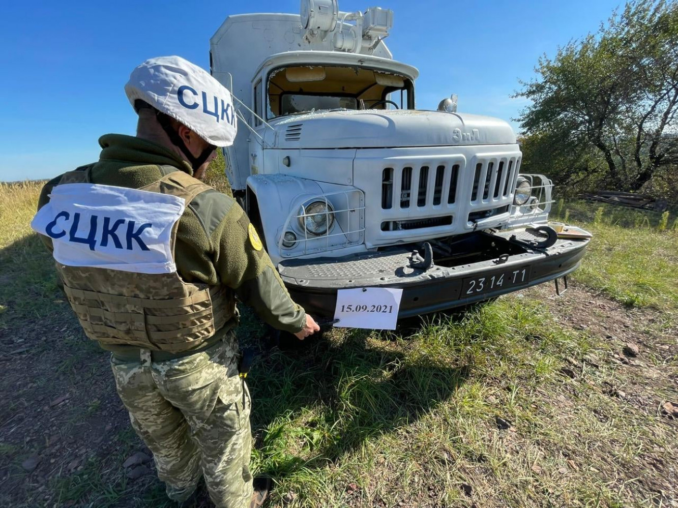 Вантажну машину української сторони Спільного центру з контролю та координації питань припинення вогню та стабілізації лінії розмежування сторін (СЦКК) обстріляли бойовики на Донбасі ввечері 14 вересня.