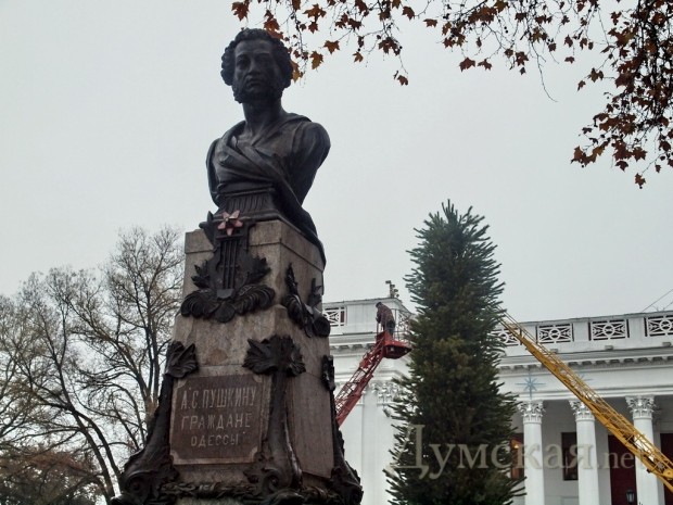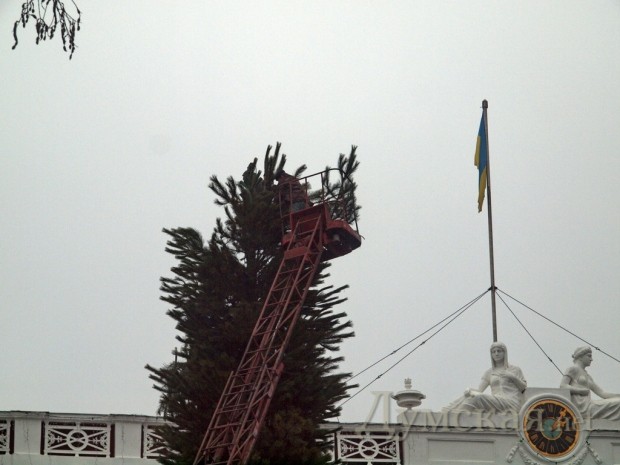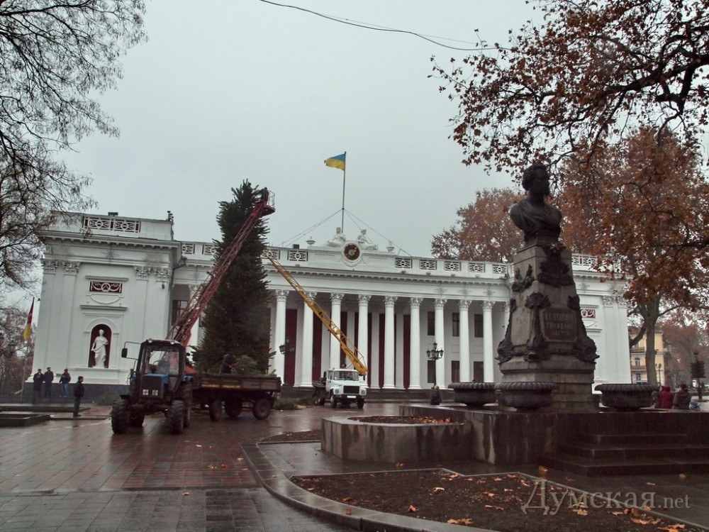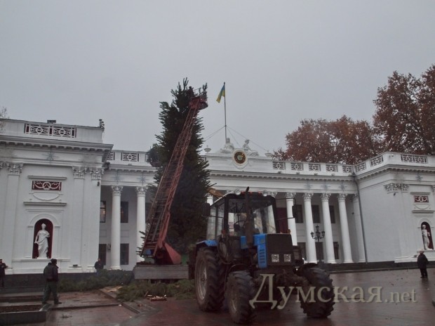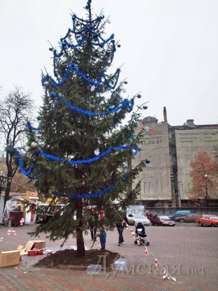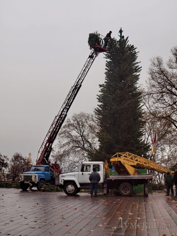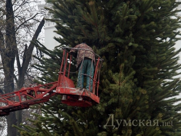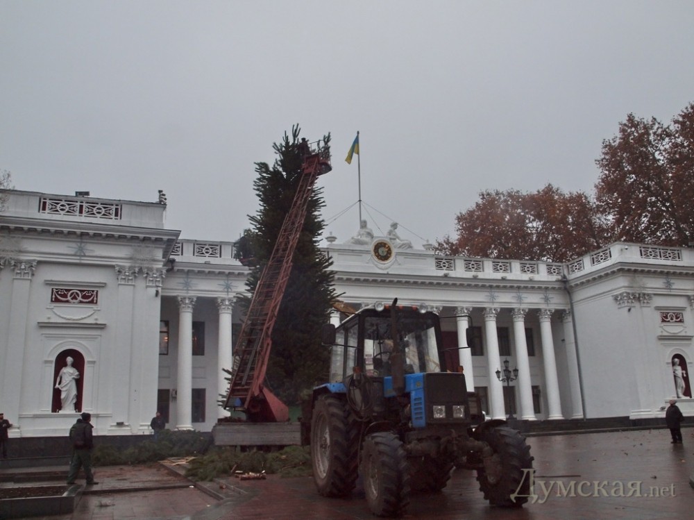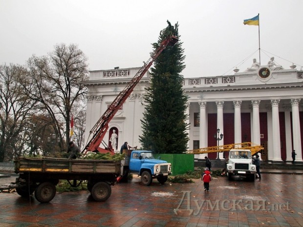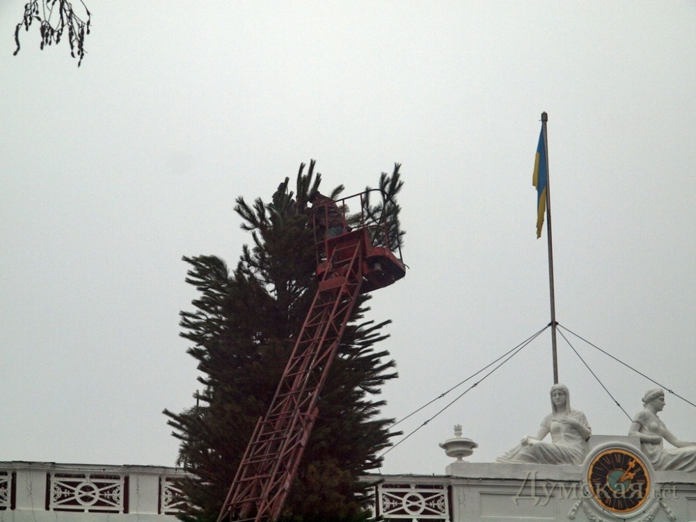 Главная зеленая красавица Одессы выросла на Думской площади. По словам директора КП «Горзелентрест» Александра Риффы, это сборная конструкция, на которую ушло три сотни сосенок высотой от полутора до двух с половиной метров. Стоимость такой елки — несколько десятков тысяч гривен. Работы по установке начались в 13 часов и заняли несколько часов.
