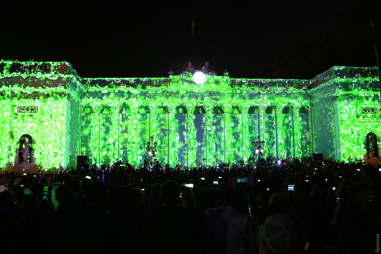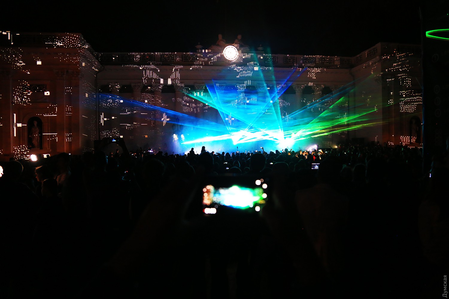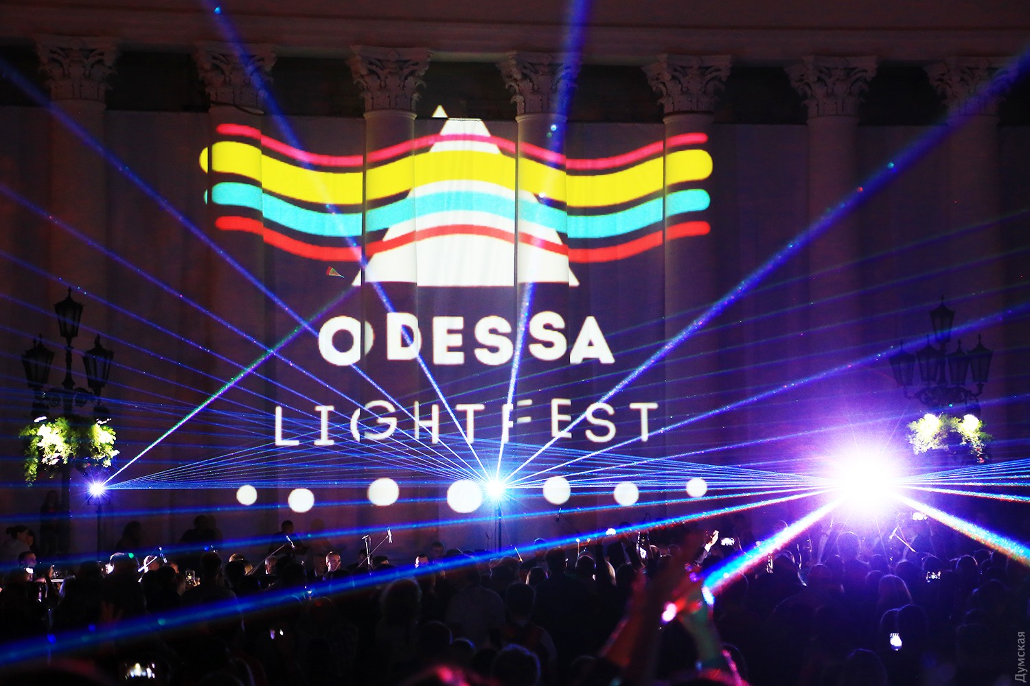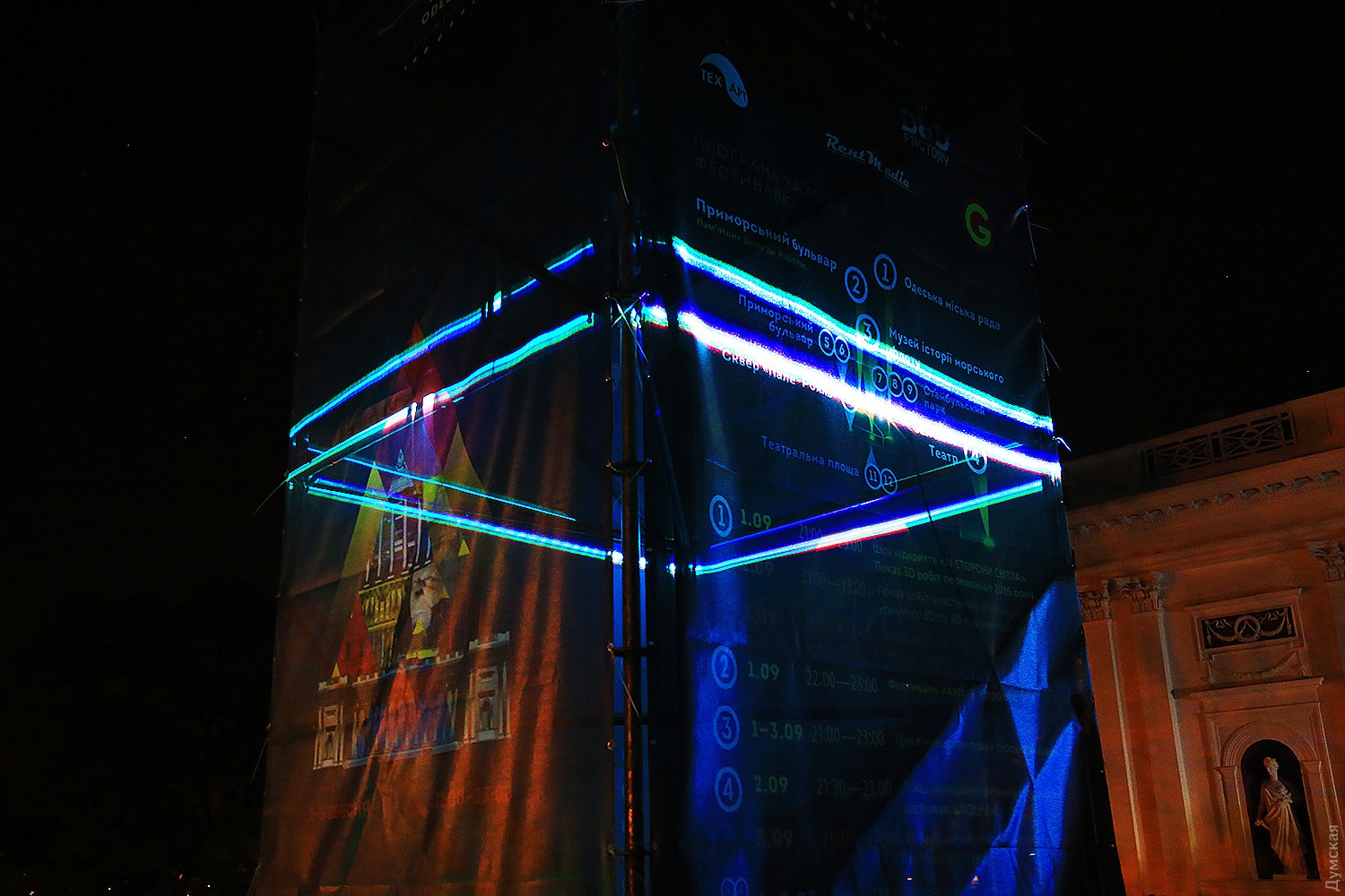 Сегодня вечером на Думской площади стартовал второй фестиваль света Odesa Light Fest. Представление должно было начаться в 21:00, но слегка задержалось, и первые световые и лазерные инсталляции зрители увидели только в 21:20.