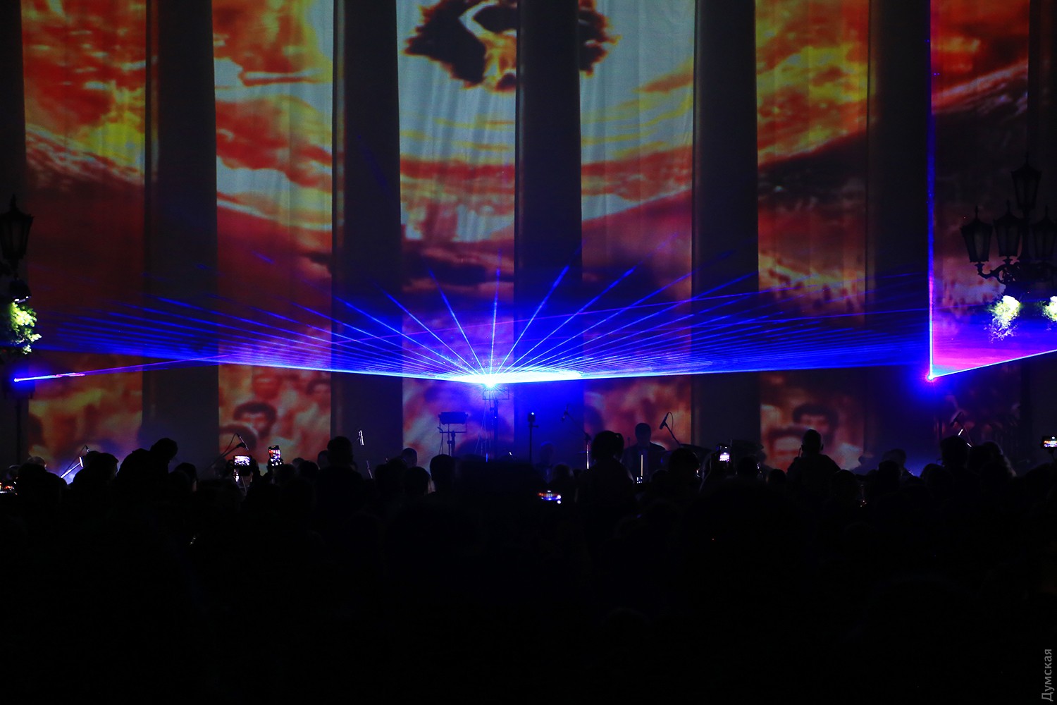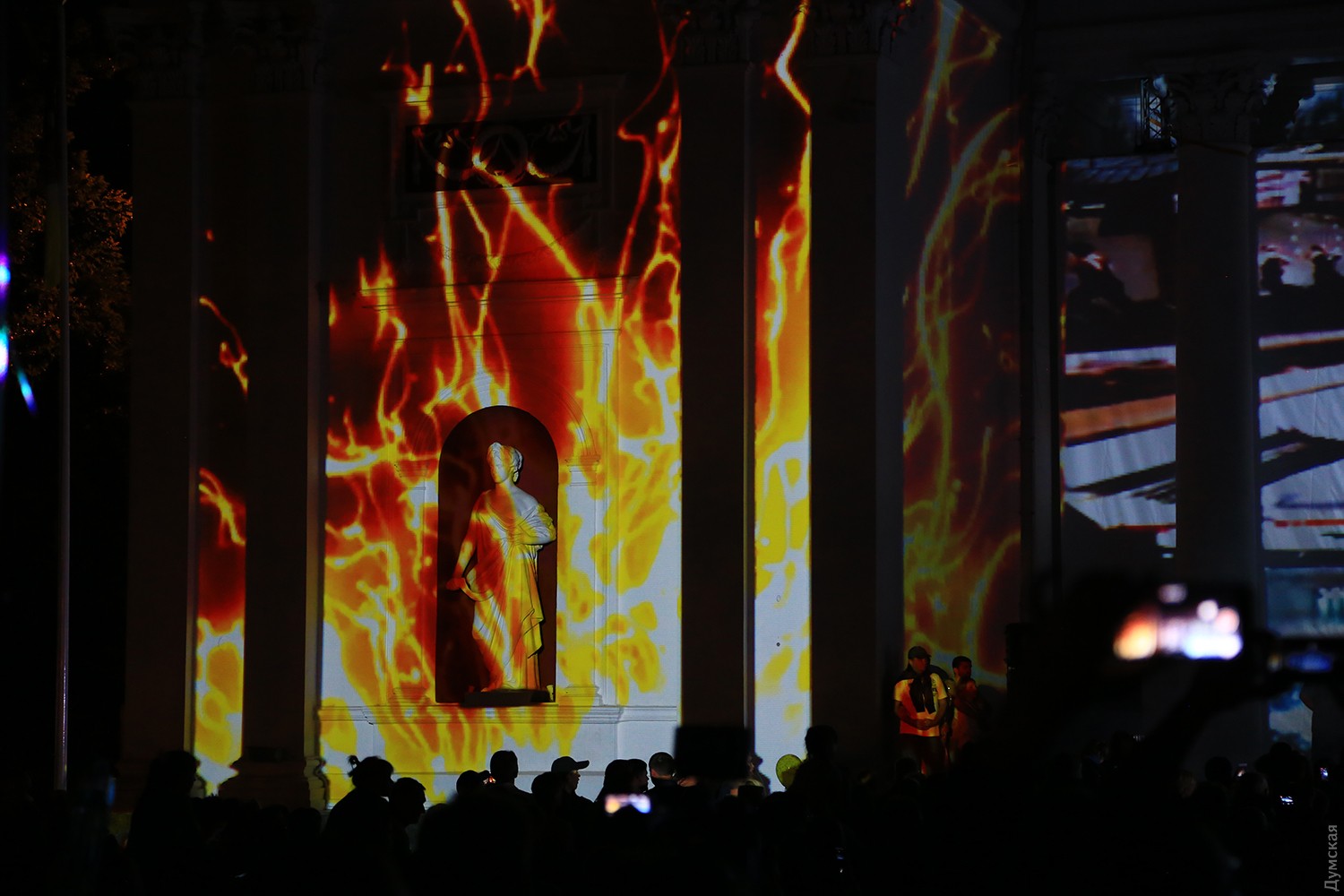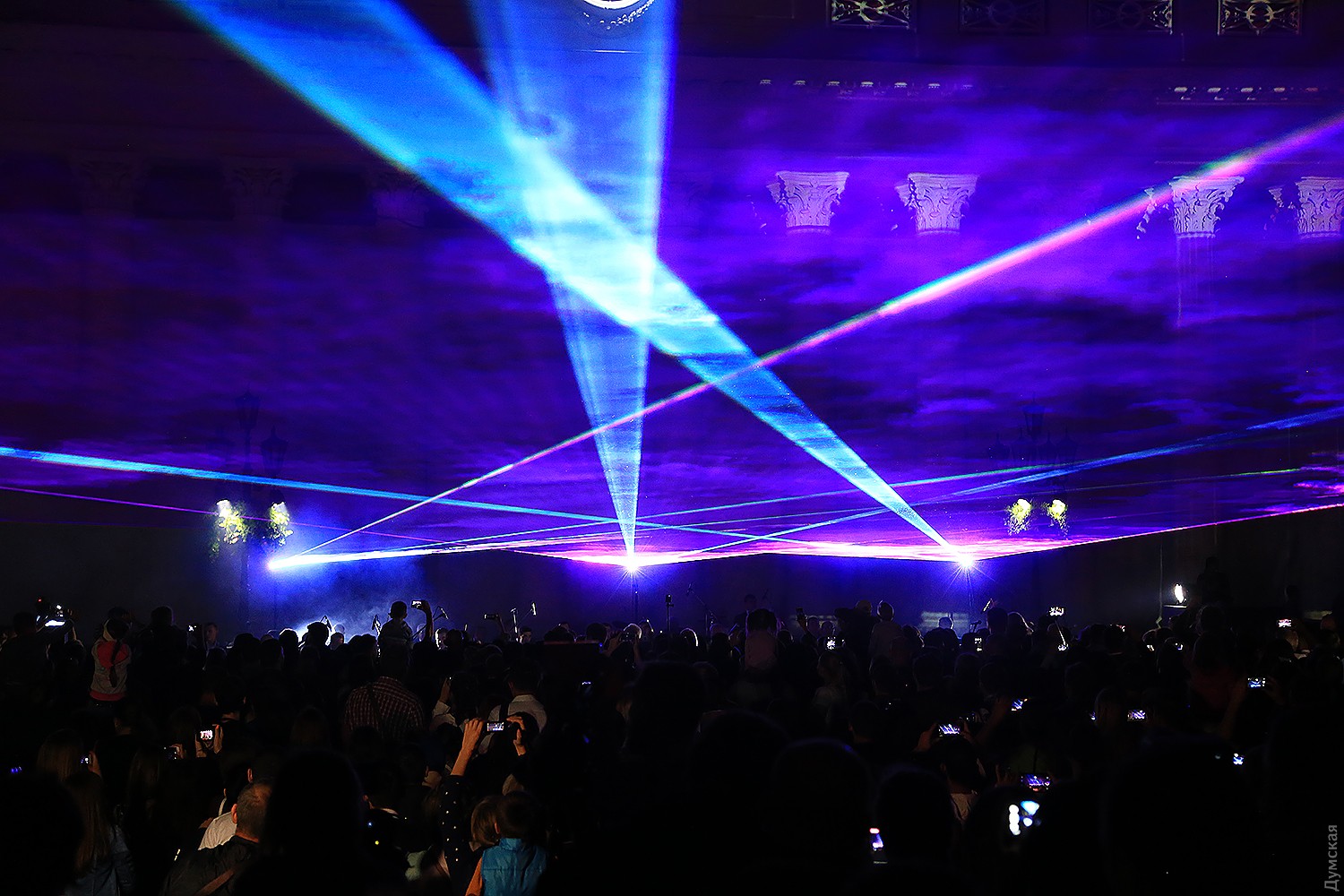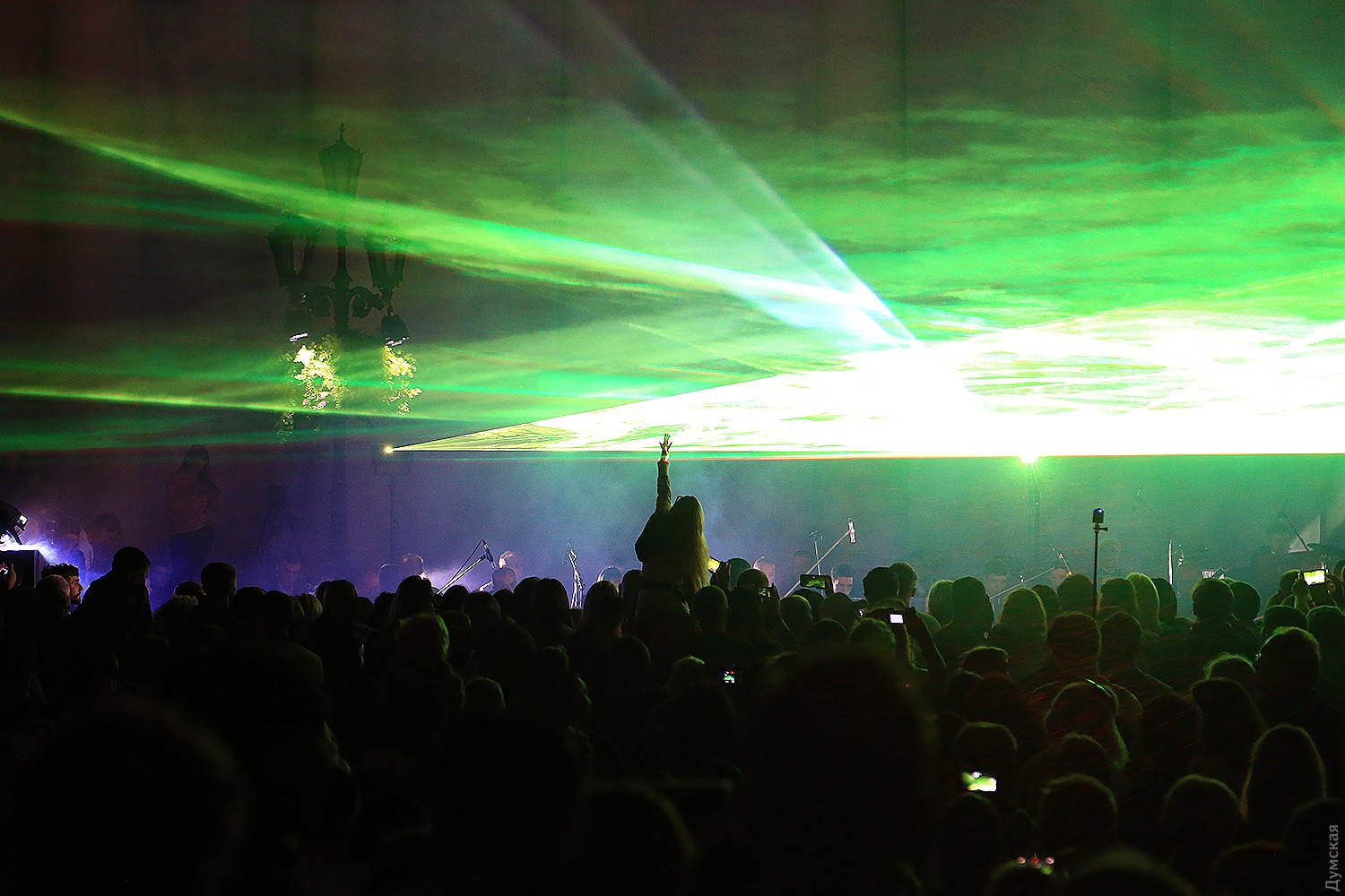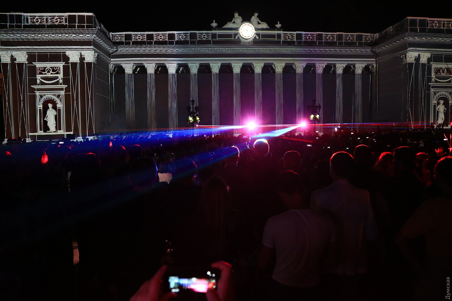 Сегодня вечером на Думской площади стартовал второй фестиваль света Odesa Light Fest. Представление должно было начаться в 21:00, но слегка задержалось, и первые световые и лазерные инсталляции зрители увидели только в 21:20.