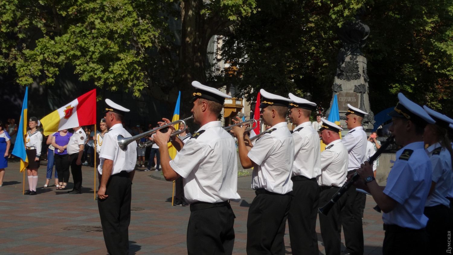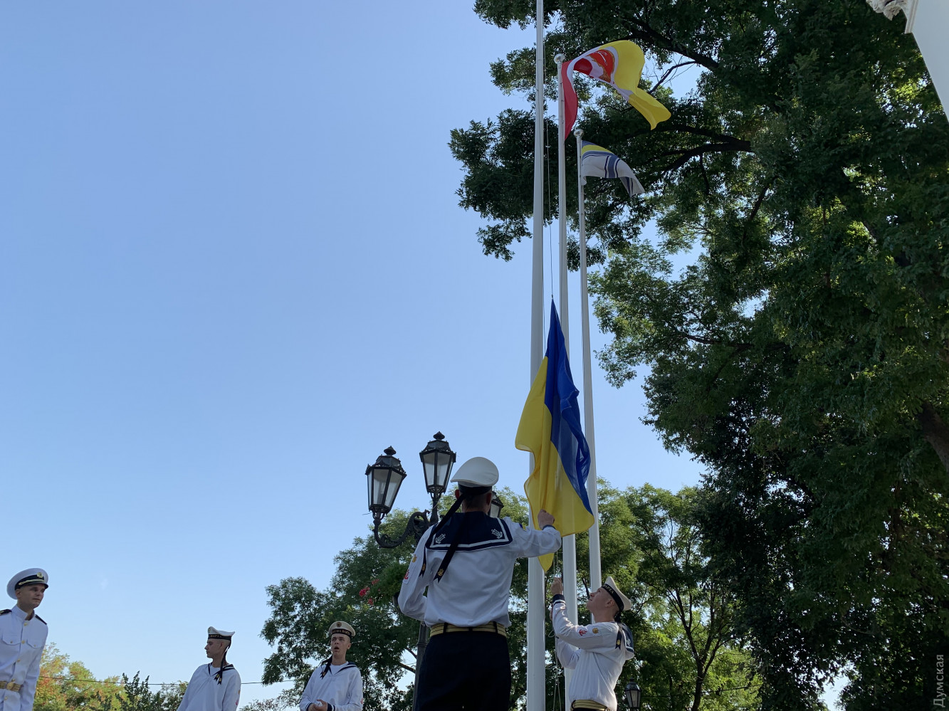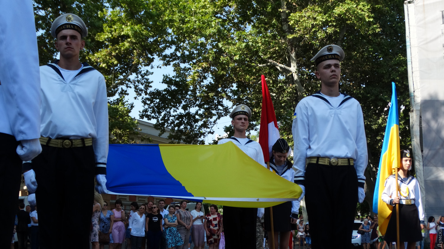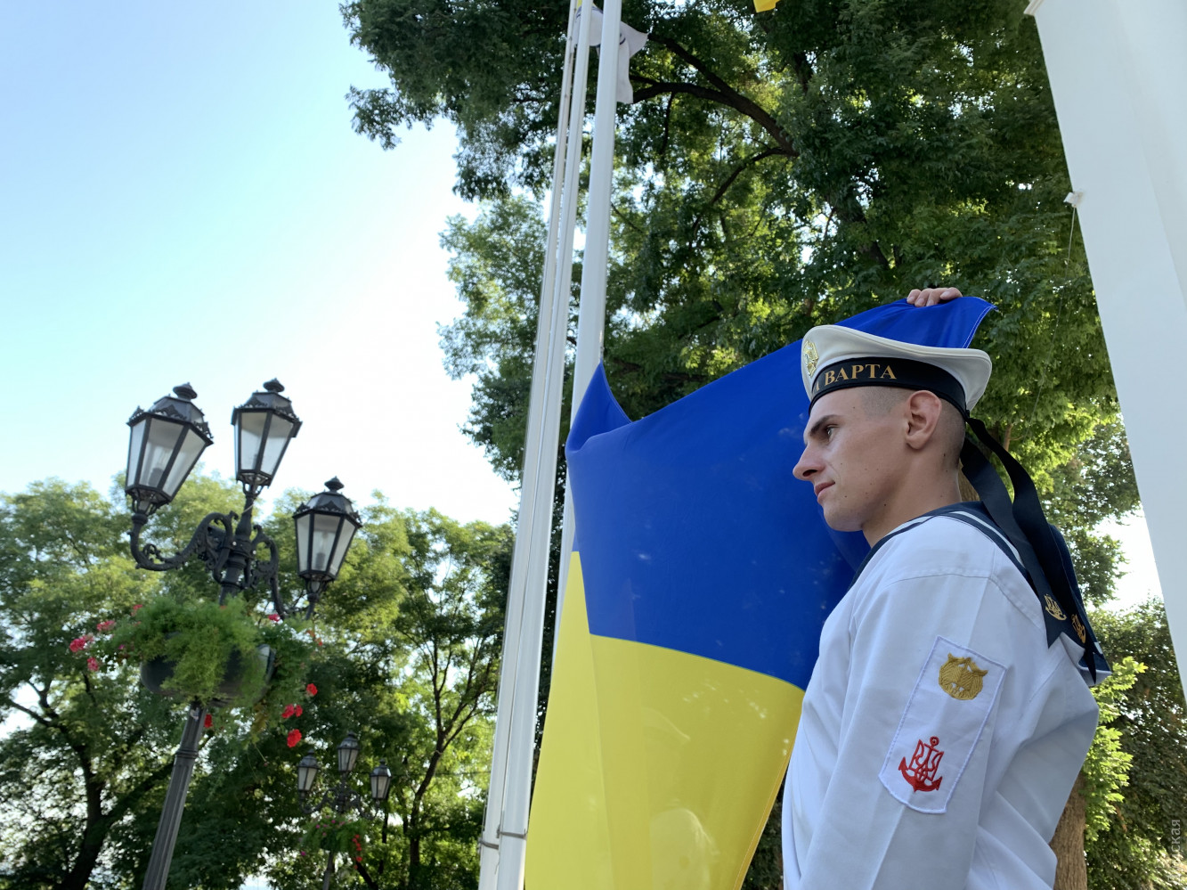 На церемонии поднятия флага присутствовал командующий Военно-морскими силами Украины адмирал Игорь Воронченко. В комментарии «Думской» военачальник поздравил всех украинцев с праздником и пожелал веры в победу: