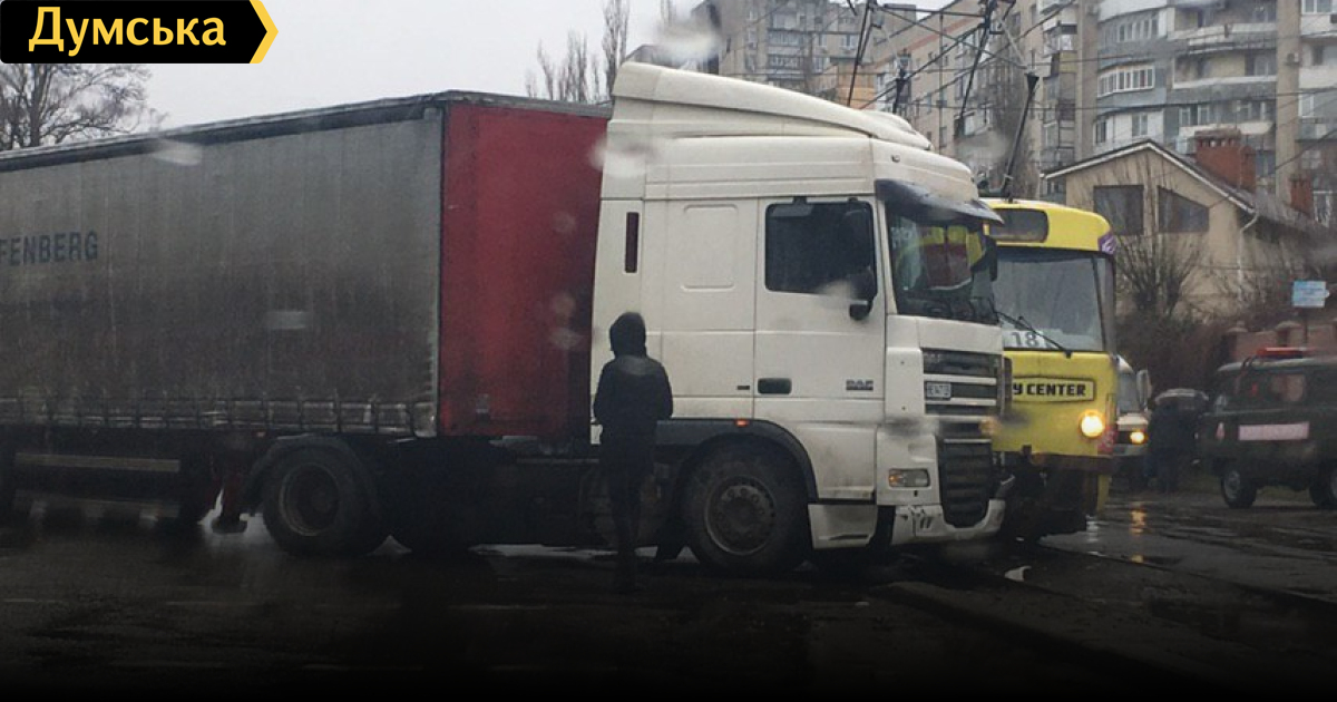 Авария с участием трамвая и грузового автомобиля DAF произошла сегодня около 10:30 на Фонтанской дороге в районе 8-ой станции. В пресс-службе «ОГЭТ» сообщили, что во время движения трамвая № 18 грузовик неожиданно выехал на рельсовое полотно.