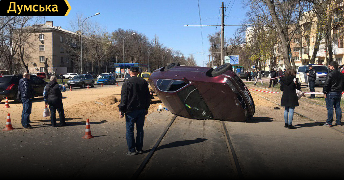 Машину отбросило на трамвайные рельсы. При этом было повреждено дорожное покрытие.