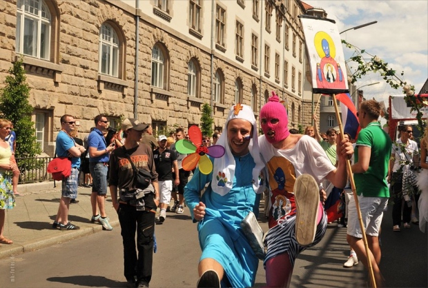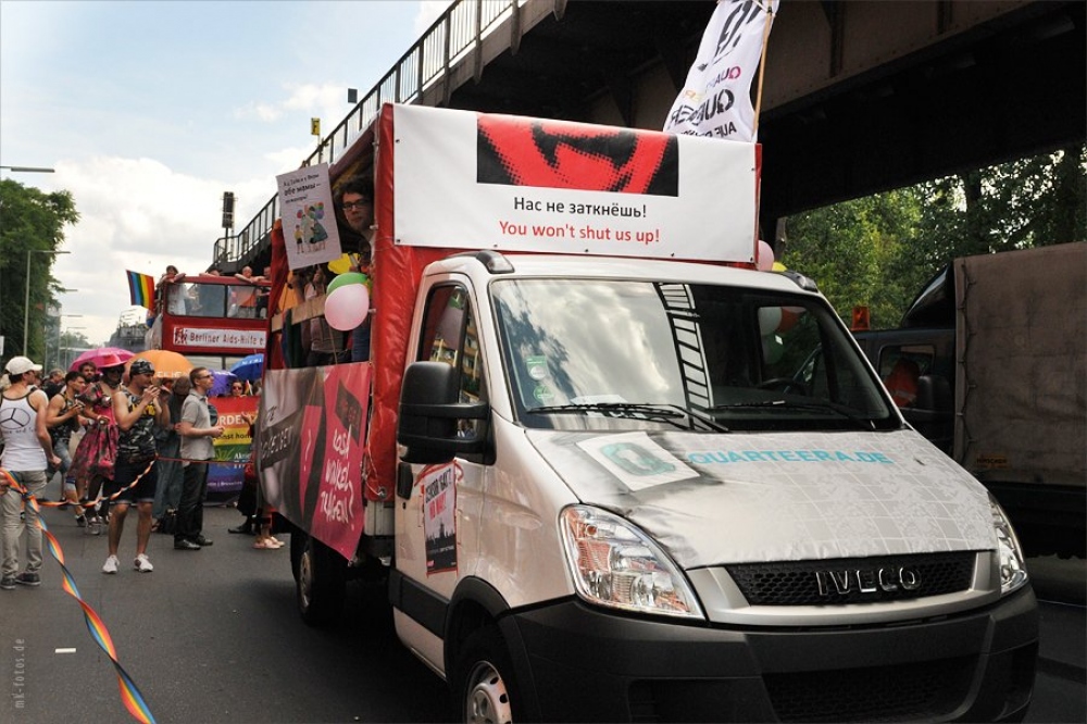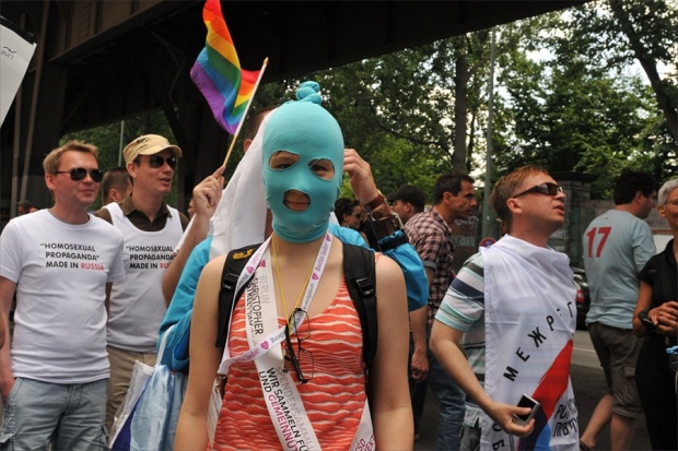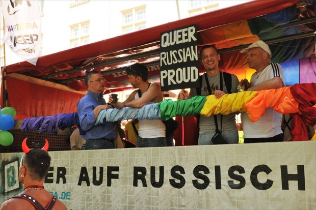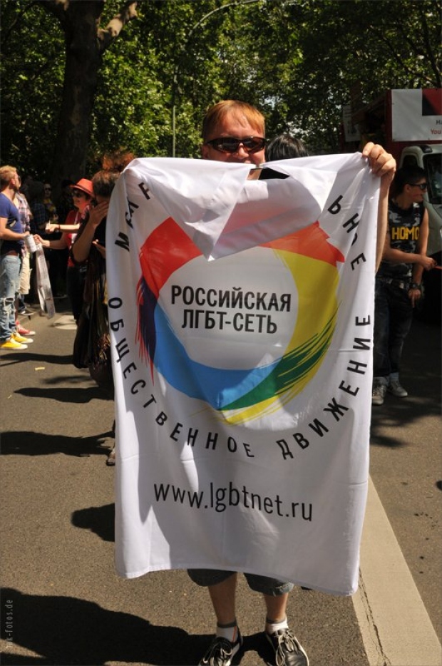 Несколько плакатов были посвящены гомофобии в России, отмечает агентство. Так, участники приготовили гигантские портреты президента РФ Владимира Путина и премьер-министра Дмитрия Медведева в красочном стиле фотохудожников Пьера и Жиля. На плакатах было написано «Нет гомофобии в России», а на футболках — «Не смотрите на меня, по российским законам вы от этого станете геем». Несколько человек своими костюмами намекали на поощрение гомофобии со стороны РПЦ.