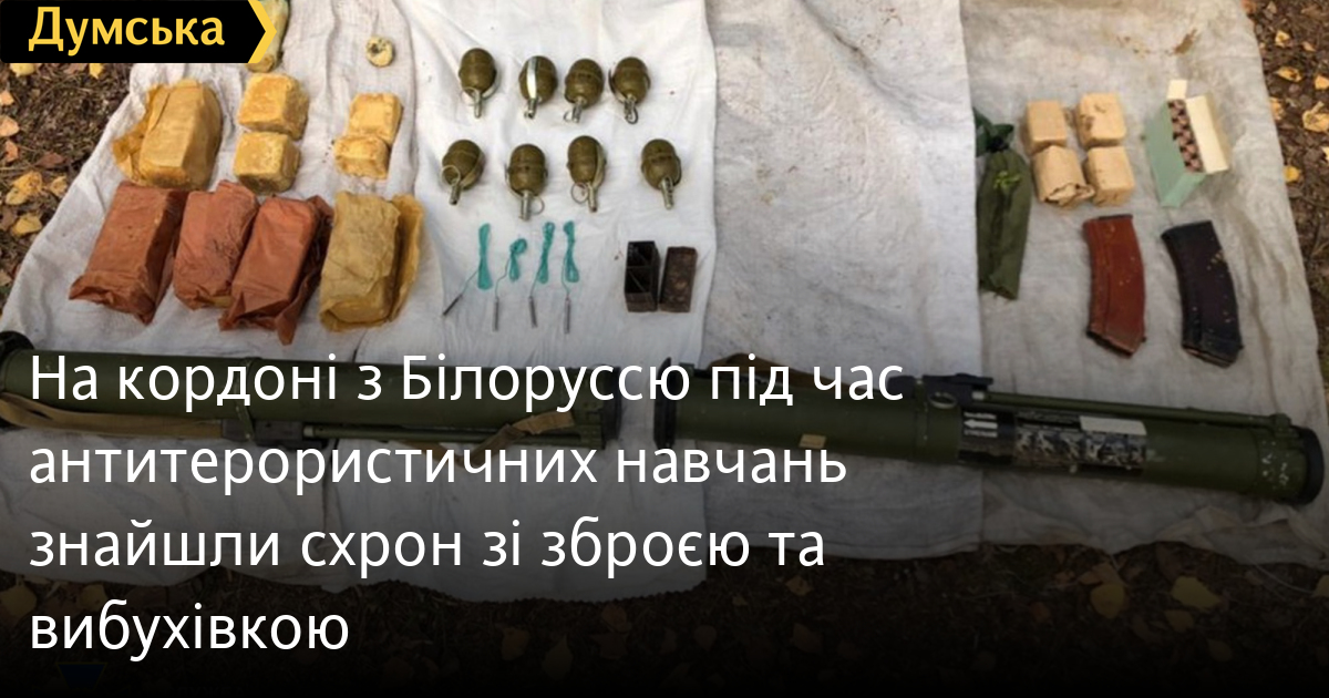На кордоні з Білоруссю під час антитерористичних навчань знайшли схрон зі зброєю та вибухівкоюСхрон із військовими засобами ураження та вибухівкою виявили під час антитерористичних навчань у Рівненській області співробітники Служби безпеки України. Як повідомляє прес-центр СБУ, арсенал заховали у лісосмузі поблизу селища Бутове, яке межує з Республікою Білорусь. Серед знайденого — дві реактивні протитанкові гранати РПГ-26, вісім ручних гранат РГД-5 із запалами до них, п'ять кілограмів вибухової речовини (попередньо пластид), два магазини до АК-74, 170 патронів калібру 5,45 та 7,62. Тайник знайшли під час відпрацювання прикордонної смуги державного кордону України в ході однієї із фаз навчань СБУ. Вилучені боєприпаси та засоби ураження направлено на проведення вибухо-технічних експертиз. Тривають слідчі дії, відкрито кримінальне провадження за ч. 1 ст. 263 (зберігання боєприпасів, вибухових речовин без дозволу) КК України.