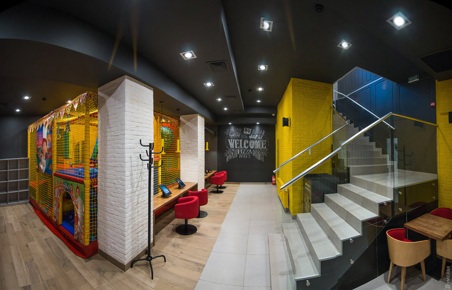 Поддерживаю. Да ещё и подгоревшая пицца. Вход в заведение сельмаг веселее! А дизайн интерьера вообще ужас: эти кирпичные стены, которые уже 100 лет как немодны, чёрный цвет в тесном помещении с низкими потолками да ещё этот решётчатый деревянный пылесборник В такой тюремной камере пицца должна быть небесной вкусноты!