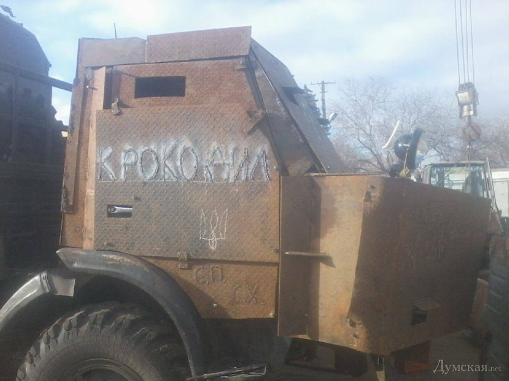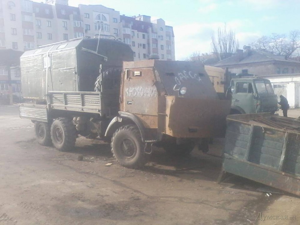 Продолжая славные традиции дедов, которые во время обороны города от румынско-немецких захватчиков создали знаменитый танк «На испуг» (обшитый стальными листами трактор с пулеметом), одесситы изготовили импровизированную бронемашину для зоны АТО. Как рассказали «Думской» в организации «Совет общественной безопасности», броневик представляет собой грузовой автомобиль КамАЗ, на который наварили стальные плиты. Также имеется слой специальной керамики.