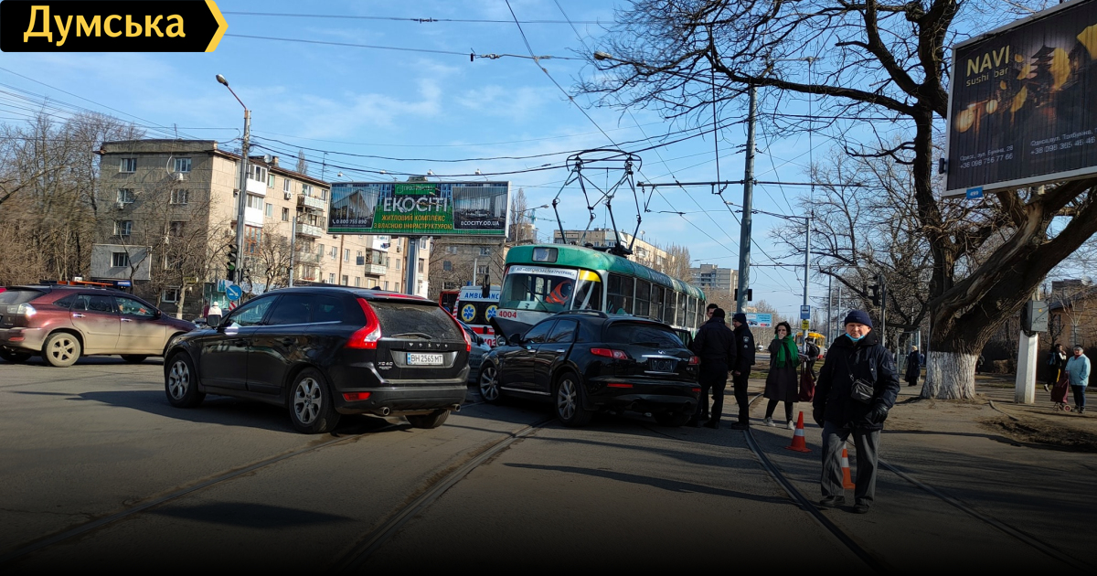 Травмы получила пассажир легковой машины. Ее забрала скорая. ОБНОВЛЕНО В 10:36. По информации патрульной полиции, водитель «Инфинити», двигаясь по Люстдорфской дороге в сторону площади Толбухина, не уступил трамваю, в результате чего и произошло столкновение. Движение трамвайных маршрутов №3,13,27 временно приостановлено. Фото Ивана Бошку