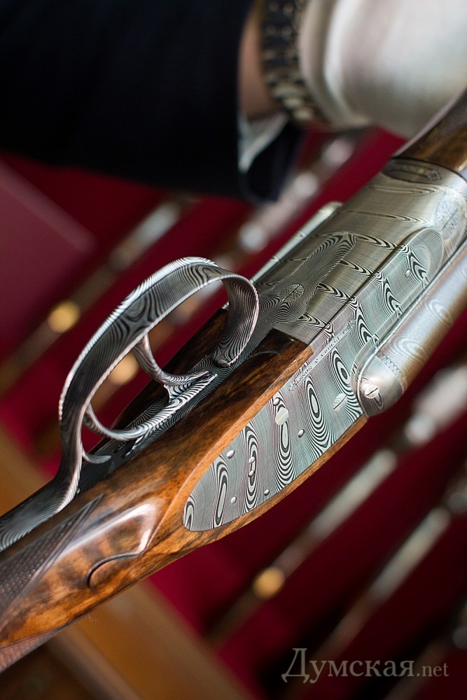 По словам Владимира Строкаченко, владельца магазина, где выставлены произведения оружейного искусства, это первая выставка James Purdey & Sons Ltd, Gun & Rifle Makers на постсоветском пространстве. Всего в наш город привезли семь единиц охотничьего оружия. Каждое из ружей уникально, было изготовлено вручную с использованием самых современных технологий и дорогих материалов, покрыто филигранной резьбой. Большинство предназначено для охоты на птицу. Это, впрочем, совсем не означает, что с ними нельзя ходить на кабана. Однако есть среди экспонатов выставки и ружья для настоящего африканского сафари, способные свалить с ног африканского буйвола. Самое необычное ружье и, как признался совладелец компании Найджел Бомонт, его любимое выполнено из настоящей дамасской стали. «Делая его, мы решили отказаться от гравировки, чтобы оставить возможность его обладателю любоваться естественной фактурой материала», — говорит он. По словам чопорного британца, в Украине уже есть обладатели элитных ружей, хотя их можно пересчитать по пальцам одной руки. Разглашать фамилии своих клиентов господин Бомонт отказался — мол, это не в правилах компании. «Думской» удалось вытянуть из него только то, что среди представителей российской элиты покупателей продукции Purdey намного больше, чем у нас. Одесская выставка продлится всего три дня. Кроме привезенных образцов, богатенькие буратины смогут заказать и ружья на свой вкус. Правда, их придется подождать — ведь на выполнение заказа у английской фирмы уходит от двух до четырех лет. Фото — Александр Гиманов