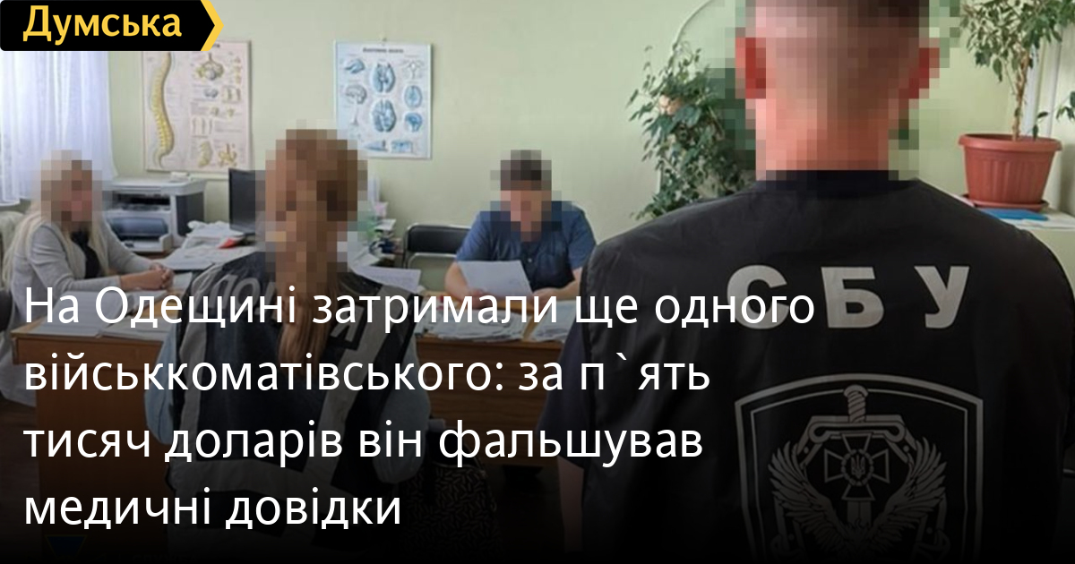 На Одещині затримали ще одного військкоматівського: за п`ять тисяч доларів він фальшував медичні довідкиПосадовця військкомату, який вимагав гроші з призовників, затримали на Одещині. Військова контррозвідка СБУ затримала його на гарячому, повідомили в спецслужбі. За 5 тис. доларів він обіцяв молодикам сфальшувати медичні документи щодо непридатності до військової служби за станом здоров’я. До злочинної діяльності він залучив свою підлеглу, яка мала домовлятися з представниками військово-лікарської комісії про фіктивні меддовідки. Помітили помилку? Виділяйте слова з помилкою та натискайте control-enter |
