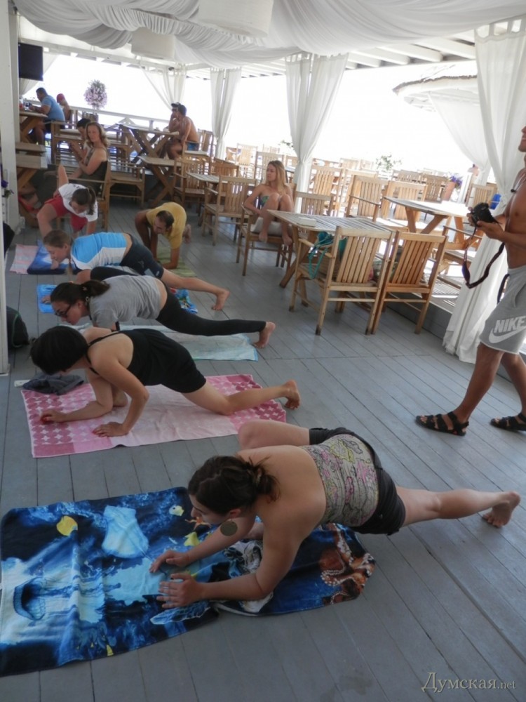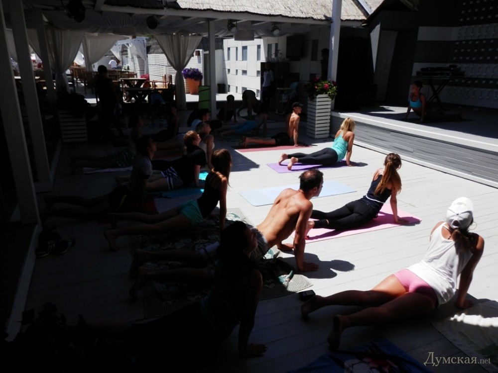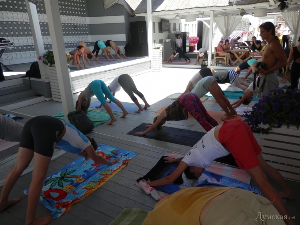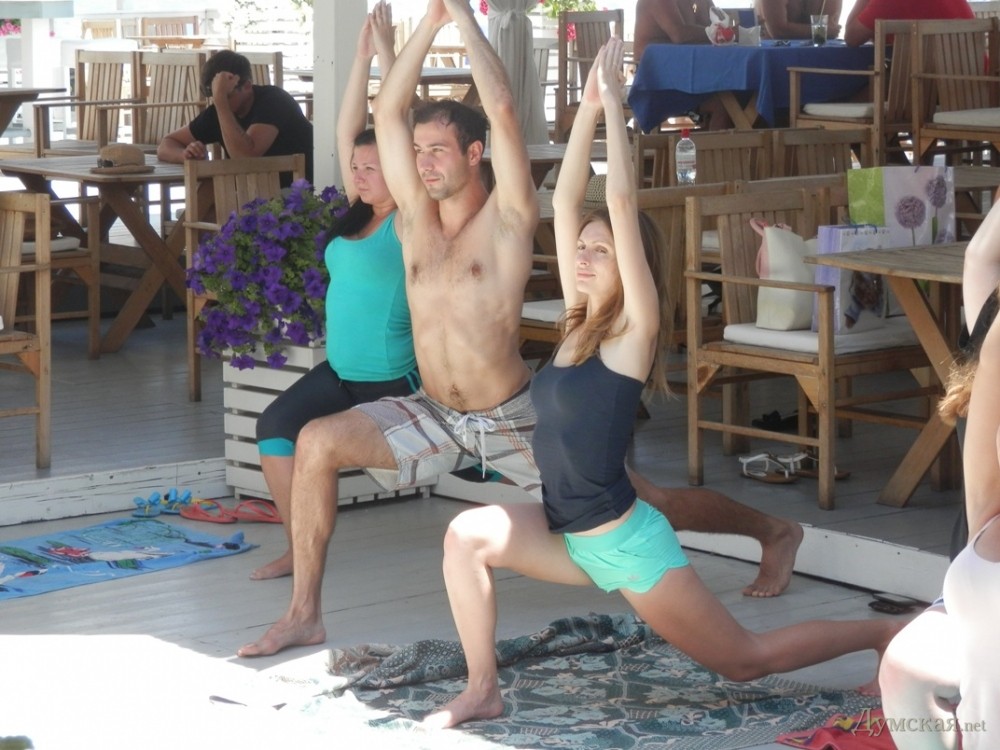 В рамках фестиваля «Хочу в Одессу» на пляже Ривьера прошел «Йога-фест». Мастер-класс одесситам дали ведущие инструкторы города. Испытать свои силы на вводном занятии пришли как опытные йоги, так и совсем новички – кто-то с легкостью садился на шпагат, а кому-то с трудом давалась поза лотоса. За тем, чтобы ученики принимали правильные асаны (так называется отдельное упражнение), следили сразу несколько инструкторов.