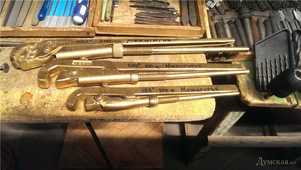 Одесские старьевщики знают, как привлечь внимание к залежалому товару. Один из таких смышленых продавцов на Староконном рынке поднял себе продажи, выкрасив старые трубные ключи золотистой краской. Он выдает их за сувениры из резиденции низложенного президента Януковича. За инструменты из «чистого золота» одессит просит по-божески – от 100 до 200 грн. Фото Одесского форума СМЕРТЬ РОСІЙСЬКИМ ОКУПАНТАМ! Помітили помилку? Виділяйте слова з помилкою та натискайте control-enter
