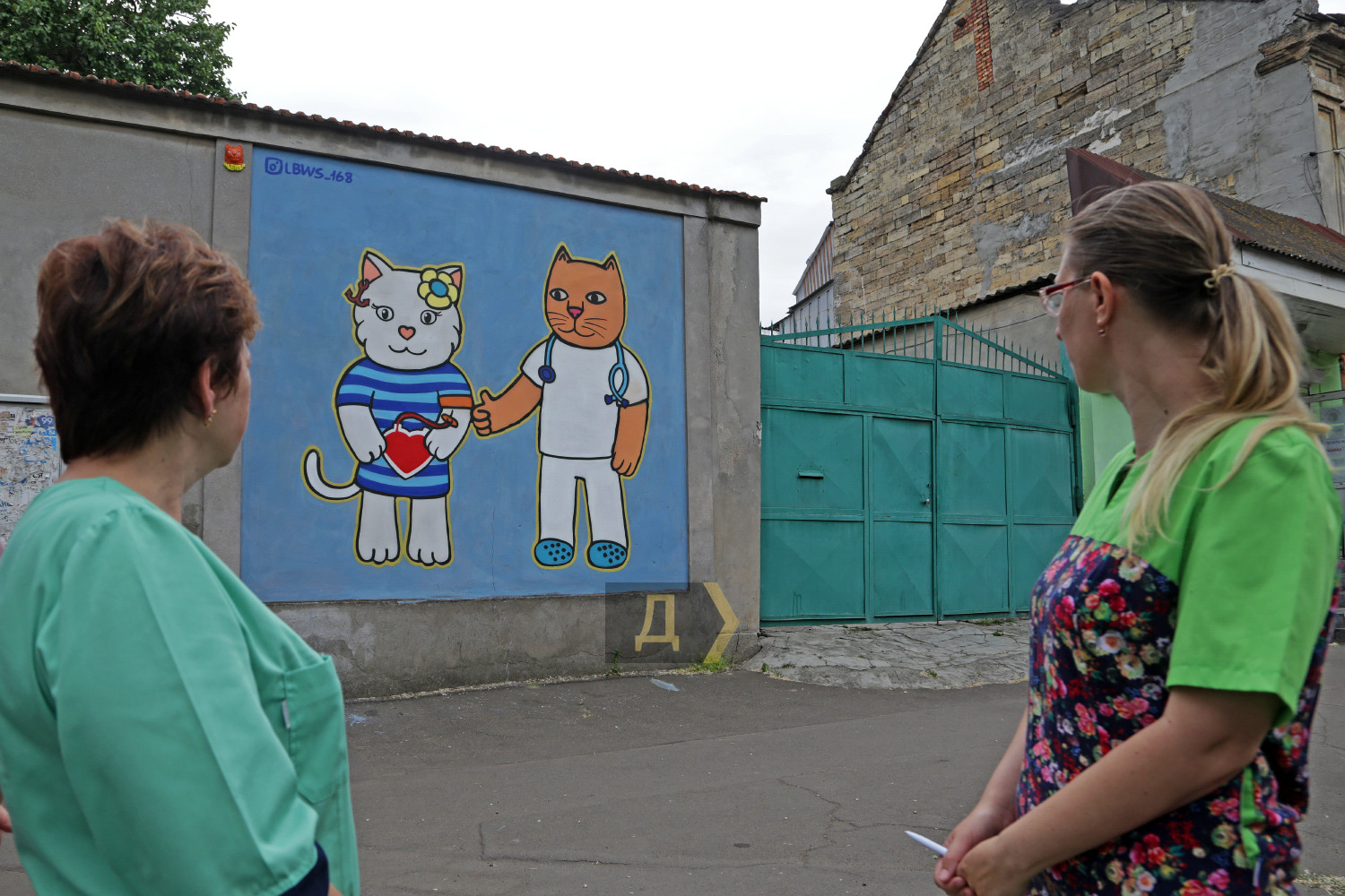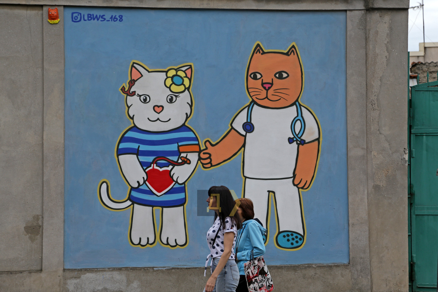 Огромное изображение на стене размером три на три метра можно увидеть напротив детской поликлиники №1, расположенной на улице Праведников Мира, 36 (бывшей Краснослободской). Один из котиков изображен донором, второй — благодарный врач.