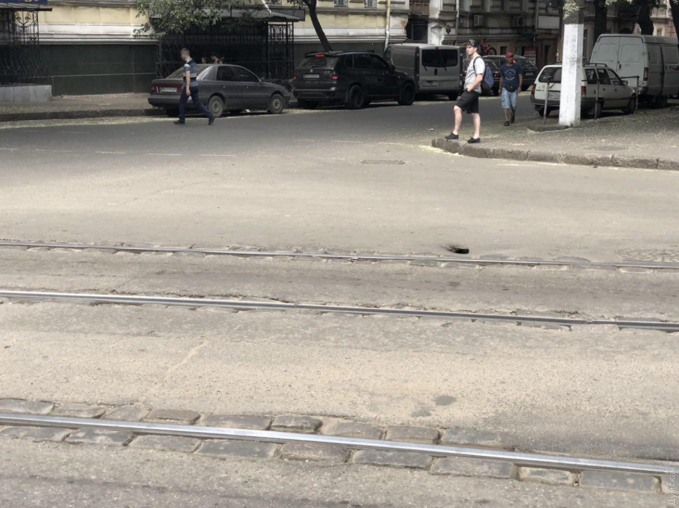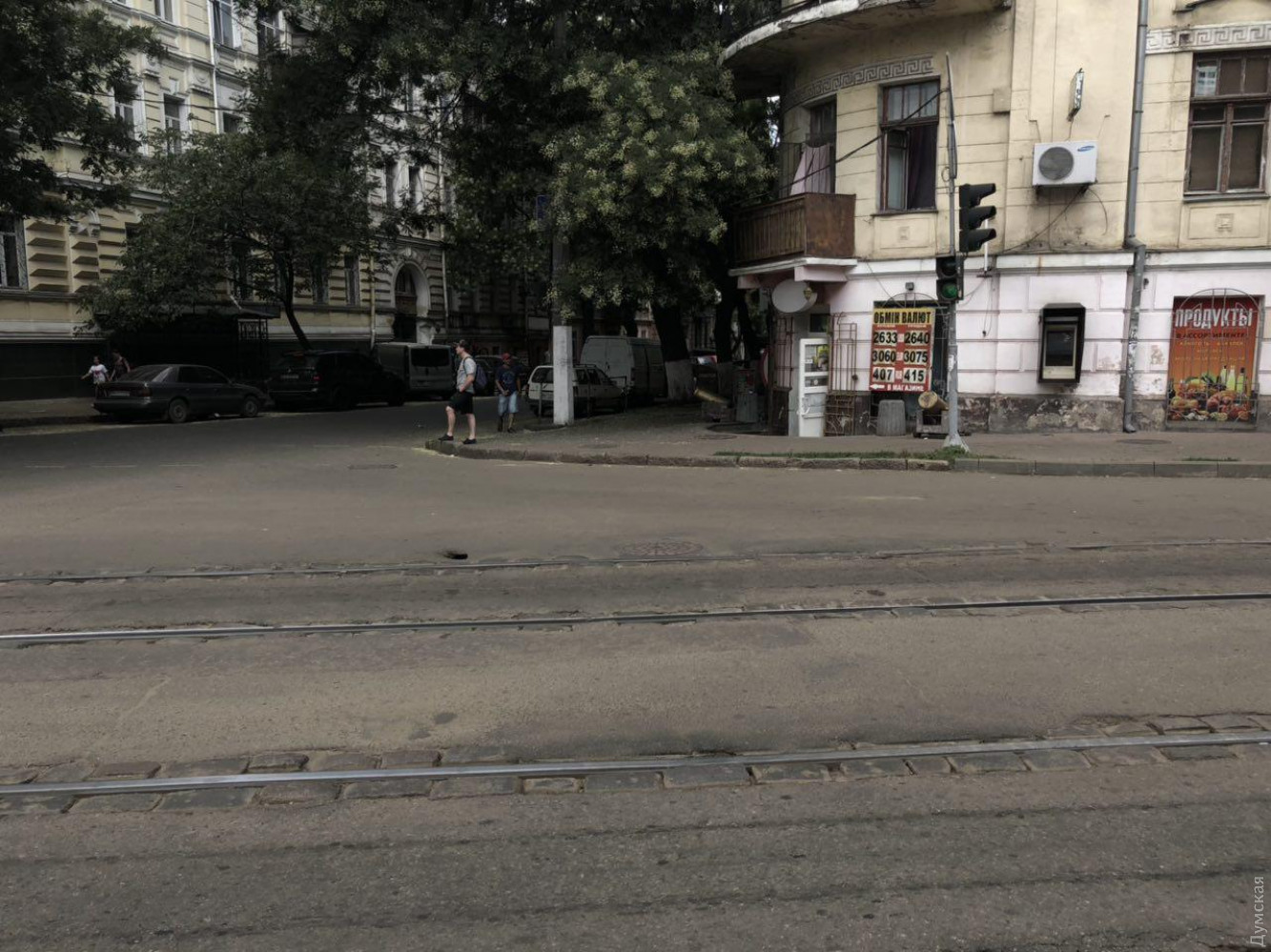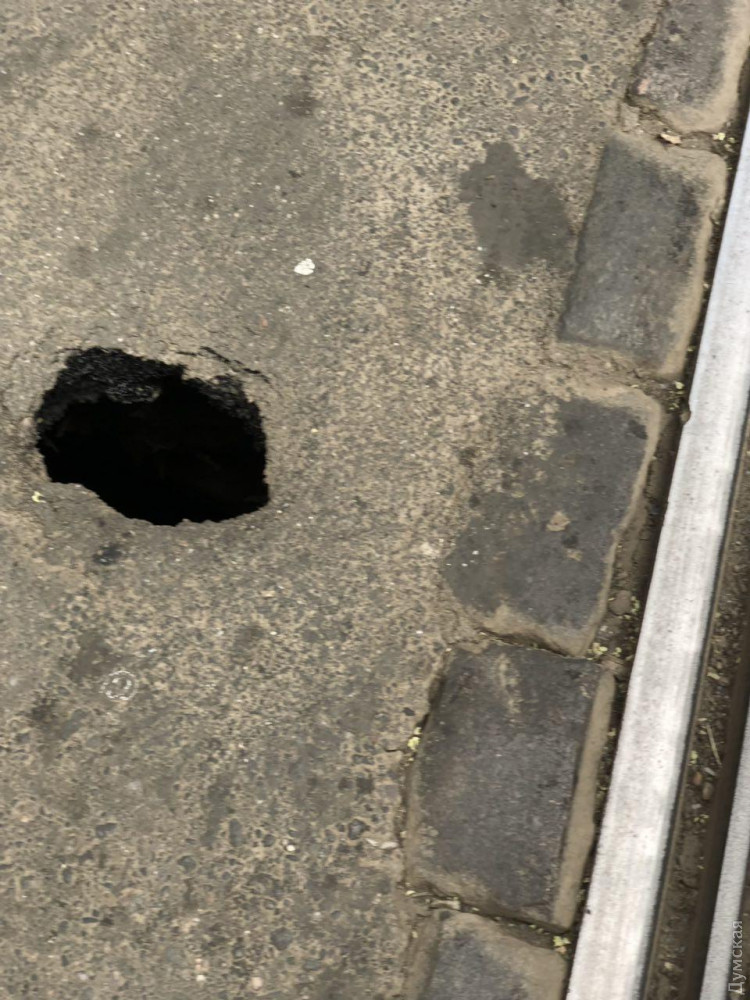 На углу Пантелеймоновской и Лейтенанта Шмидта начал образовываться провал, передает корреспондент «Думской».