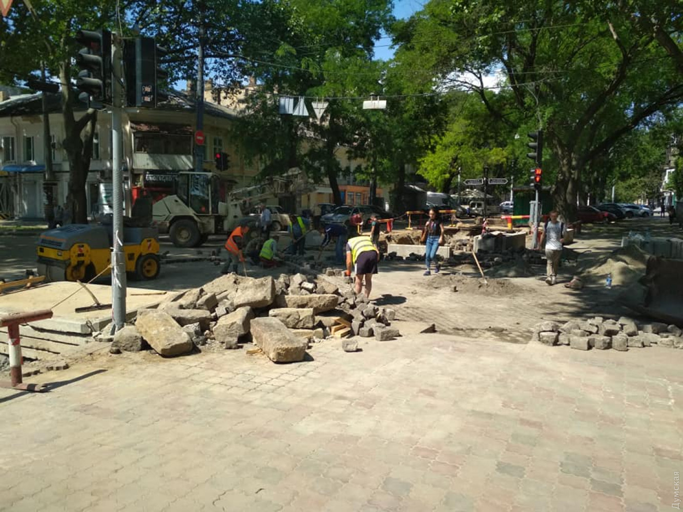 Тепловые трубы на перекрестке Пушкинской и Базарной уже поменяли, котлован зарыли, и сейчас дорожники возвращают на место старинную брусчатку. Судя по всему, они успевают до назначенного срока завершения работ — 23:00 воскресенья, — и завтра повторения пятничных транспортных проблем не будет.