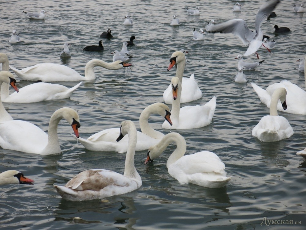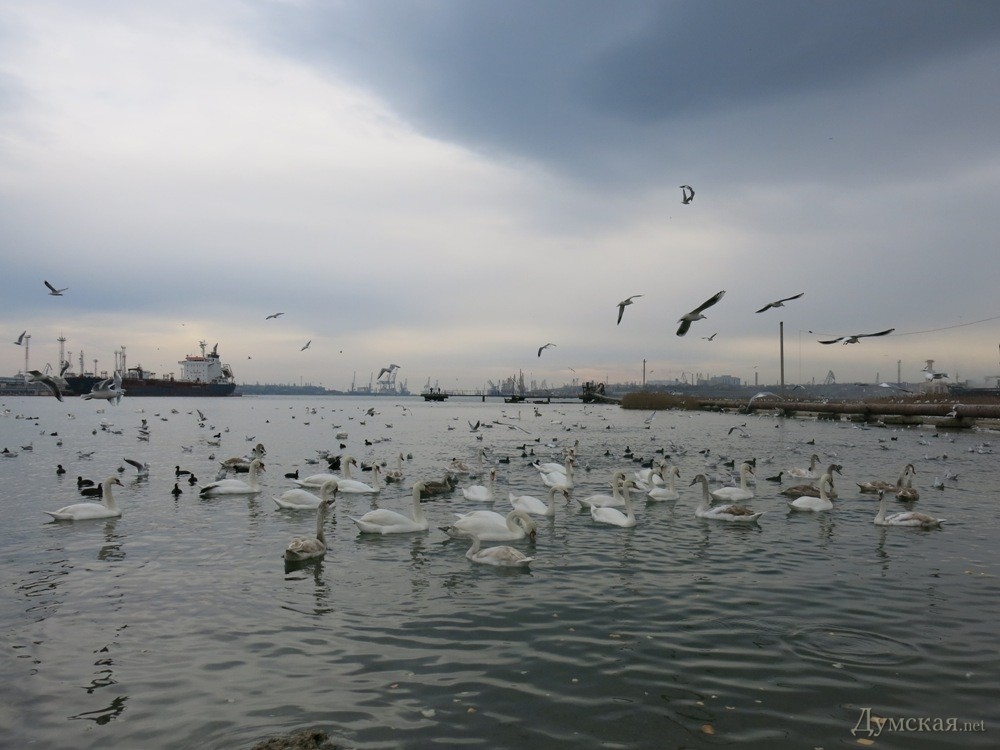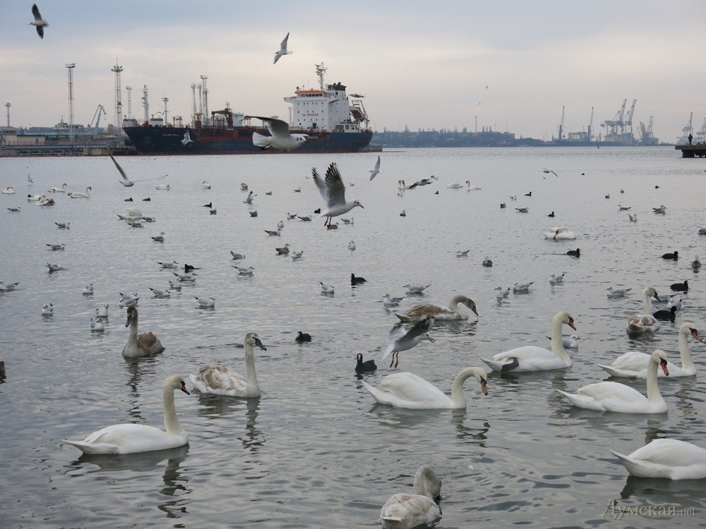 На паромной переправе, что по дороге в Ильичевск, снова зимуют лебеди и утки.