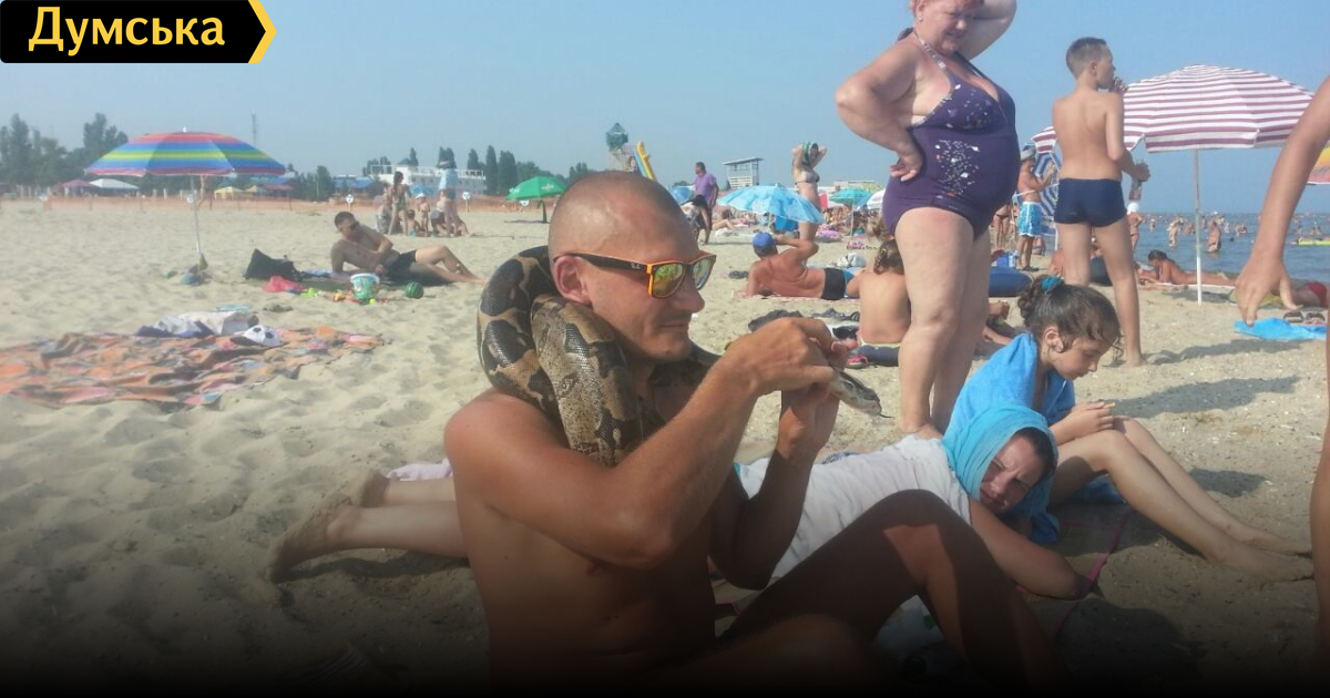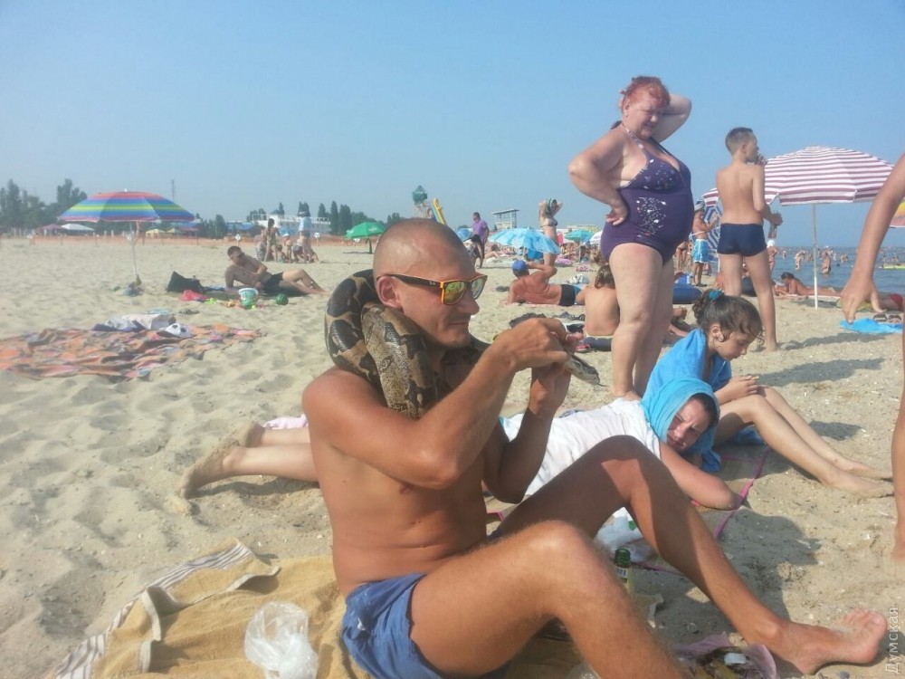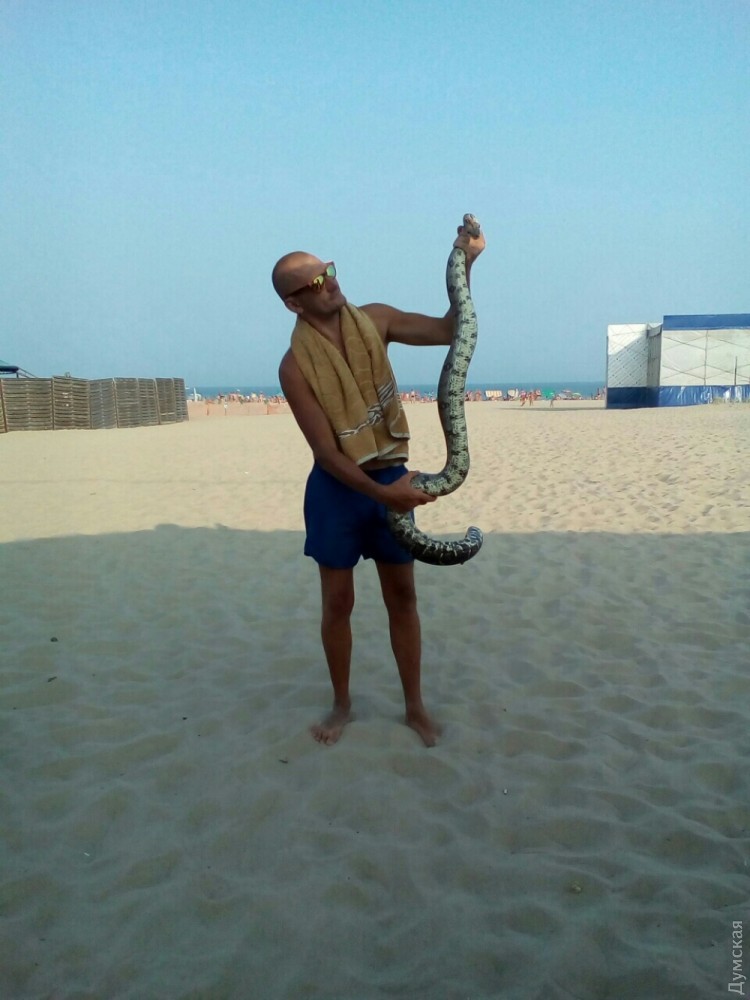 Сегодня на пляже курорта Затока, в районе станции Лиманская, был переполох. Около 18 часов отдыхающие заметили огромную змею, плывущую вдоль берега. Как передает корреспондент «Думской», отважился поймать рептилию одессит Виктор, который находится в Затоке на отдыхе. По его словам, длина змеи — более двух метров. «Похож на питона. Наверное, он сбежал от фотографов», — предположил Виктор. Находку одессит пока забрал к себе, а после решит, что с ней делать. СМЕРТЬ РОСІЙСЬКИМ ОКУПАНТАМ! Помітили помилку? Виділяйте слова з помилкою та натискайте control-enter |
