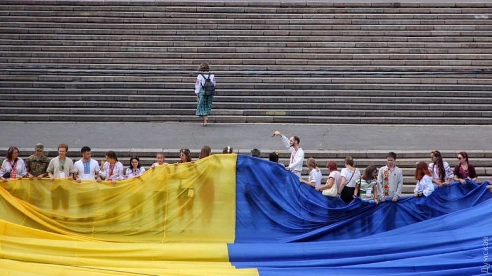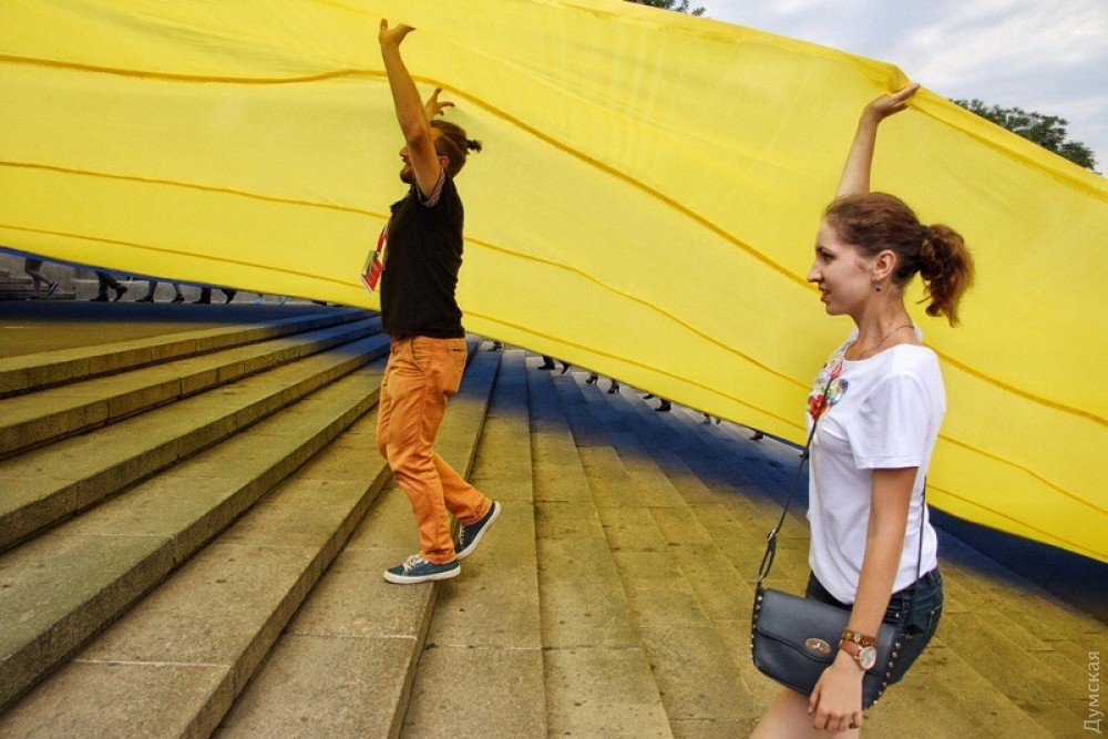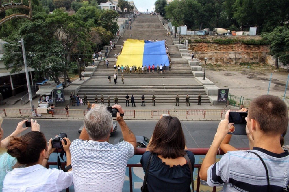 Сегодня, в День государственного флага, по уже сложившейся традиции на Потемкинской лестнице развернули огромный желто-голубой стяг. В этот раз он был 25-метровым, что соответствует возрасту независимой Украины.