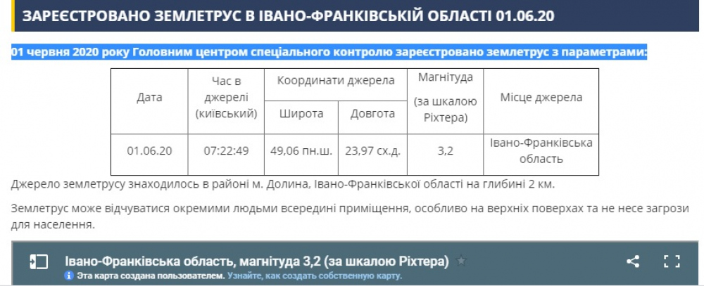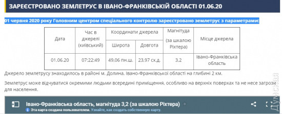 В Ивано-Франковской области зафиксировали землетрясение магнитудой 3,2 балла. Об этом сообщили на сайте Главного центра специального контроля. Толчки зафиксировали 1 июня в 7.22. Источник землетрясения находился в районе города Долинa Ивано-Франковской области на глубине 2 км. «Землетрясение могло ощущаться отдельными людьми внутри помещений, особенно на верхних этажах и не несет угрозы для населения», — отметили в ведомстве. СМЕРТЬ РОСІЙСЬКИМ ОКУПАНТАМ! Помітили помилку? Виділяйте слова з помилкою та натискайте control-enter |