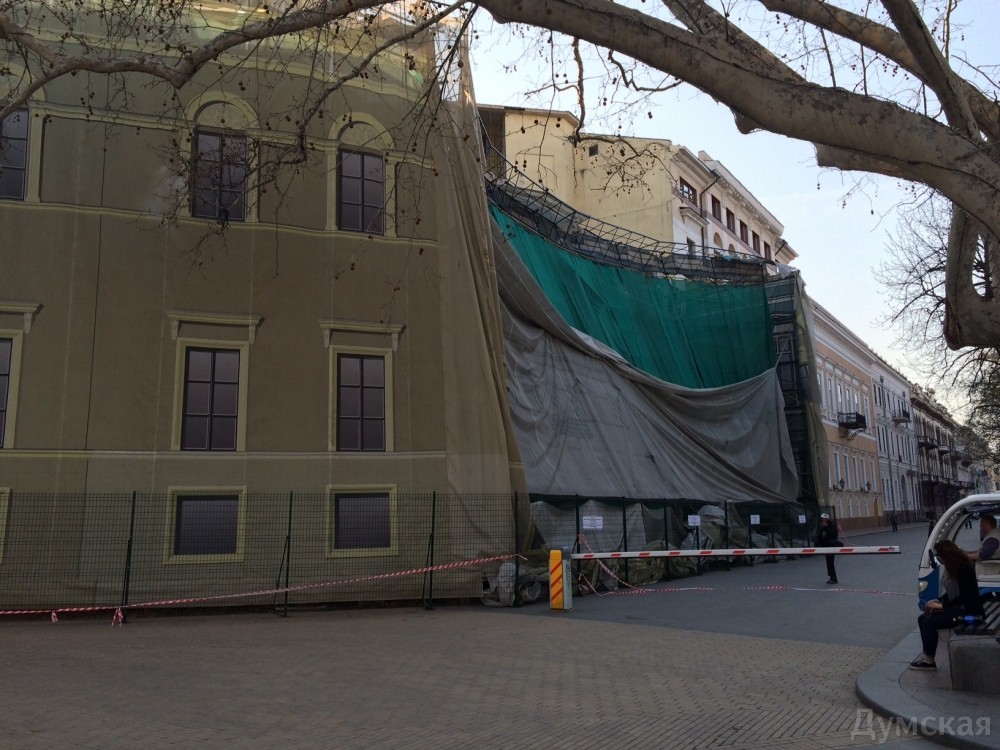 Судя по всему, леса упали во время недавнего шторма. Дом по Приморскому бульвару, 15 (переулок Чайковского, 2) был построен в 1828 году архитектором Иоганном Риглером совместно с Францем Боффо, позднее перестраивался архитектором Францем Моранди. В разное время его владельцами были Фук, Григорович, Ралли. В последние годы в здании размещалось областное статистическое управление. Нынешние владельцы дома — ЧП «Гранд-инвест» — намерены отреставрировать его, надстроив два этажа (третий и мансардный), после чего здание будет приспособлено под торгово-выставочный центр.