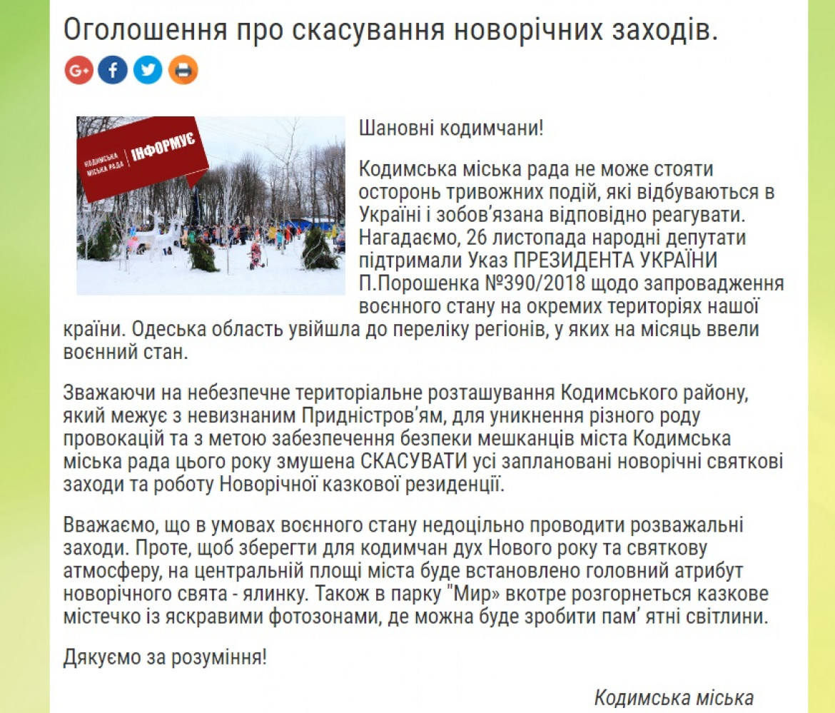 На севере Одесской области отменили новогодние мероприятия: власти опасаются провокацийГородской совет райцентра Кодыма Одесской области отменил запланированные на ближайшие дни праздничные мероприятия, ссылаясь на военное положение. Соответствующее объявление опубликовано на официальном сайте города. «Учитывая опасное территориальное расположение Кодымского района, который граничит с непризнанным Приднестровьем, во избежание разного рода провокаций и в целях обеспечения безопасности жителей города Кодымский городской совет в этом году вынуждена отменить новогодние праздничные мероприятия», — говорится в сообщении. В горсовете уточнили, что речь идет об отмене новогодних мероприятий, организованных непосредственно муниципалитетом, а именно праздничного концерта, открытия «Новогодней сказочной резиденции» в парке, запланированных на 23-24 декабря 2018 года. Отметим, что новогодние мероприятия в Киеве, Одессе и других областных центрах никто не отменял. Напомним, вчера некоторые горсоветы сообщили о запрете использования беспилотников на всей территории области (не только над военными объектами). Военные утверждают, что не просили об этом. СМЕРТЬ РОСІЙСЬКИМ ОКУПАНТАМ! Помітили помилку? Виділяйте слова з помилкою та натискайте control-enter |