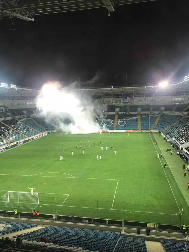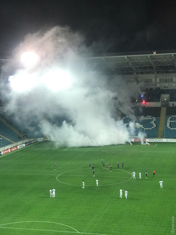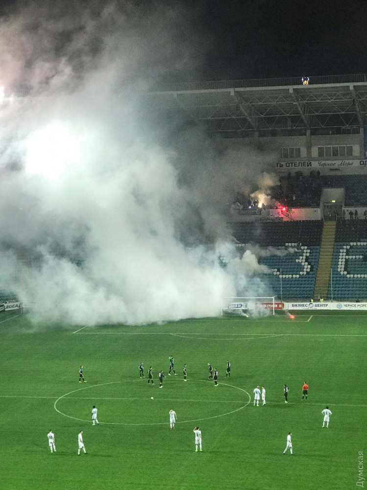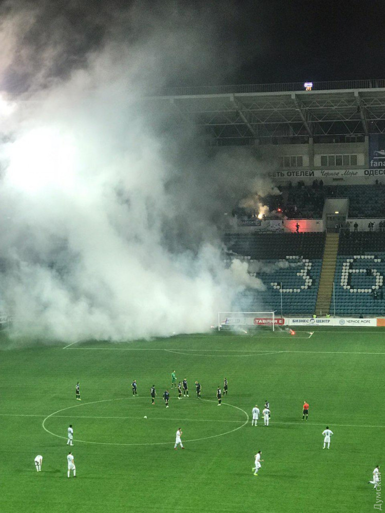 Неизвестные фанаты бросили взрывпакеты на поле стадиона «Черноморец», где проходит матч 1/8 финала Кубка Украины — одесские «моряки» играют с полтавской «Ворсклой». Как передает корреспондент «Думской», взрывы прогремели на 64-й минуте, сразу после успешного пенальти в ворота «Черноморца». Арбитр остановил встречу, но когда дым рассеялся, матч возобновился. Сейчас «Ворскла» ведет со счетом 2:1. Напомним, в минувшее воскресенье из-за бушевавших ультрас, недовольных проигрышем «Черноморца», также пришлось останавливать игру. ОБНОВЛЕНО в 20:30 Итог матча 2:1 в пользу «Ворсклы» , и в 1/8 финала вышли полтавчане. СМЕРТЬ РОСІЙСЬКИМ ОКУПАНТАМ! Помітили помилку? Виділяйте слова з помилкою та натискайте control-enter Новини по цій темі: 27 квітня 2024: Футбол: одеський «Чорноморець» програв сільському клубу і залишився на дев`ятій позиції чемпіонату України (фото) 14 березня 2024: Після скандалу в соцмережах обласна військова адміністрація заборонила проводити матч одеського "Чорноморця" з глядачами |