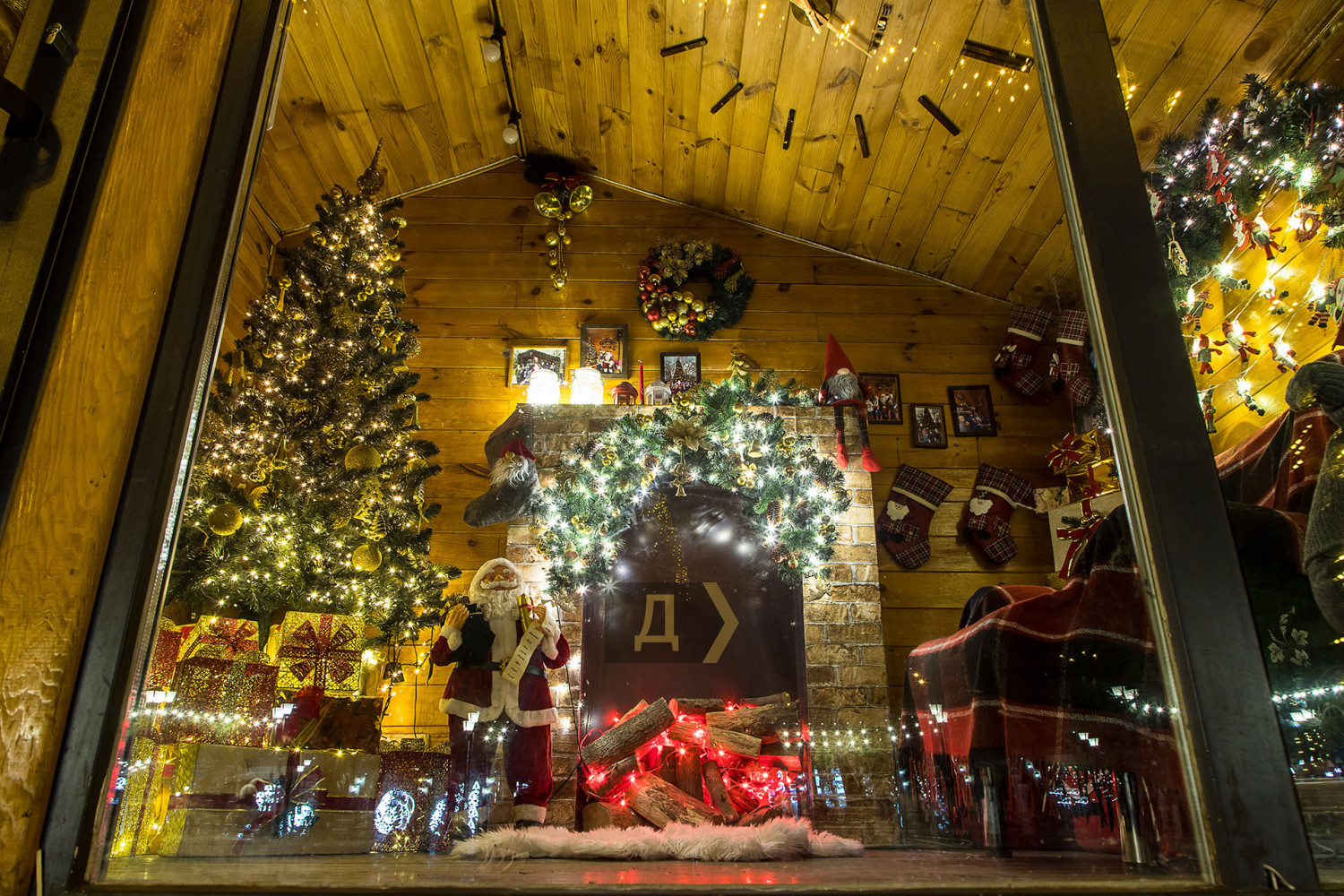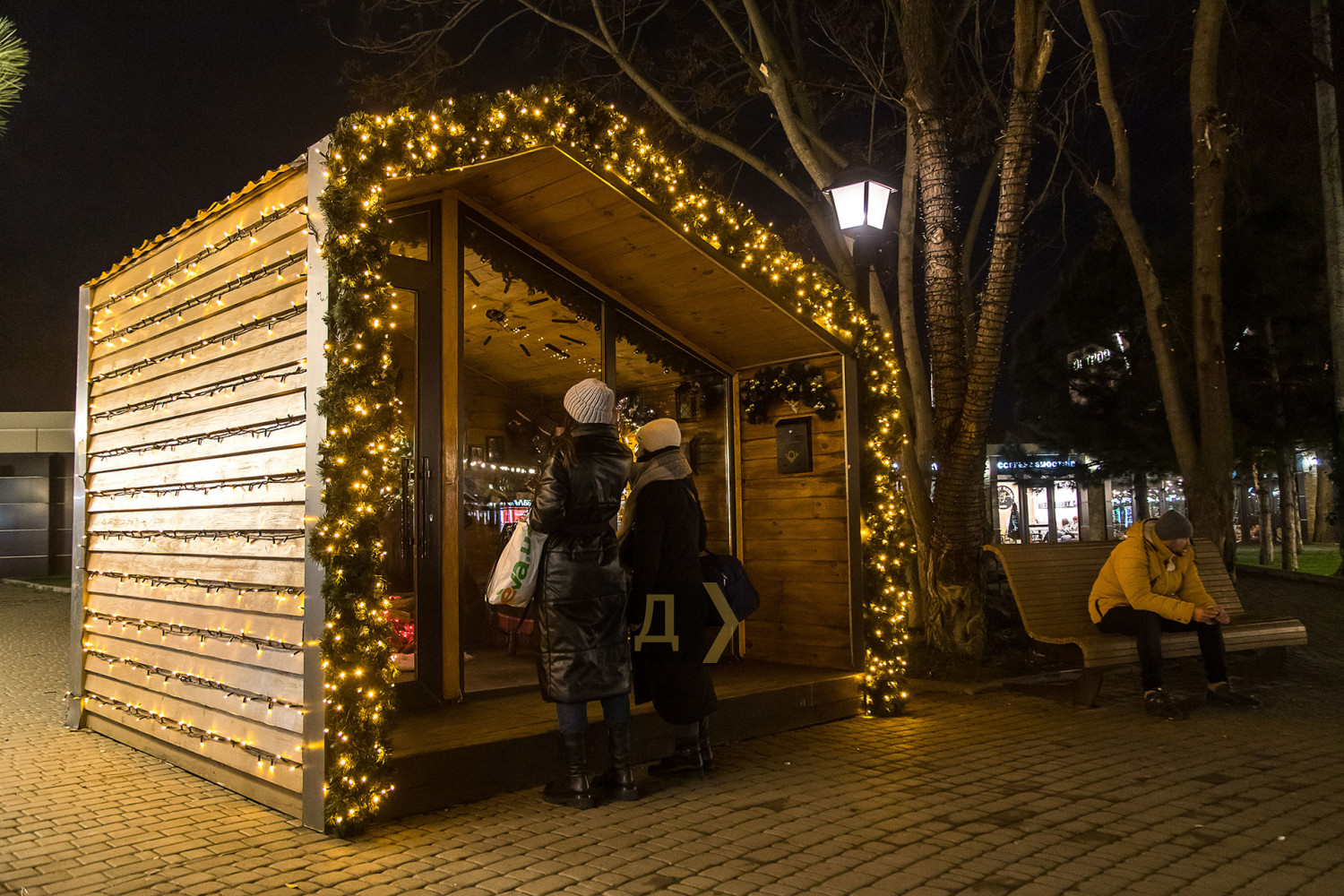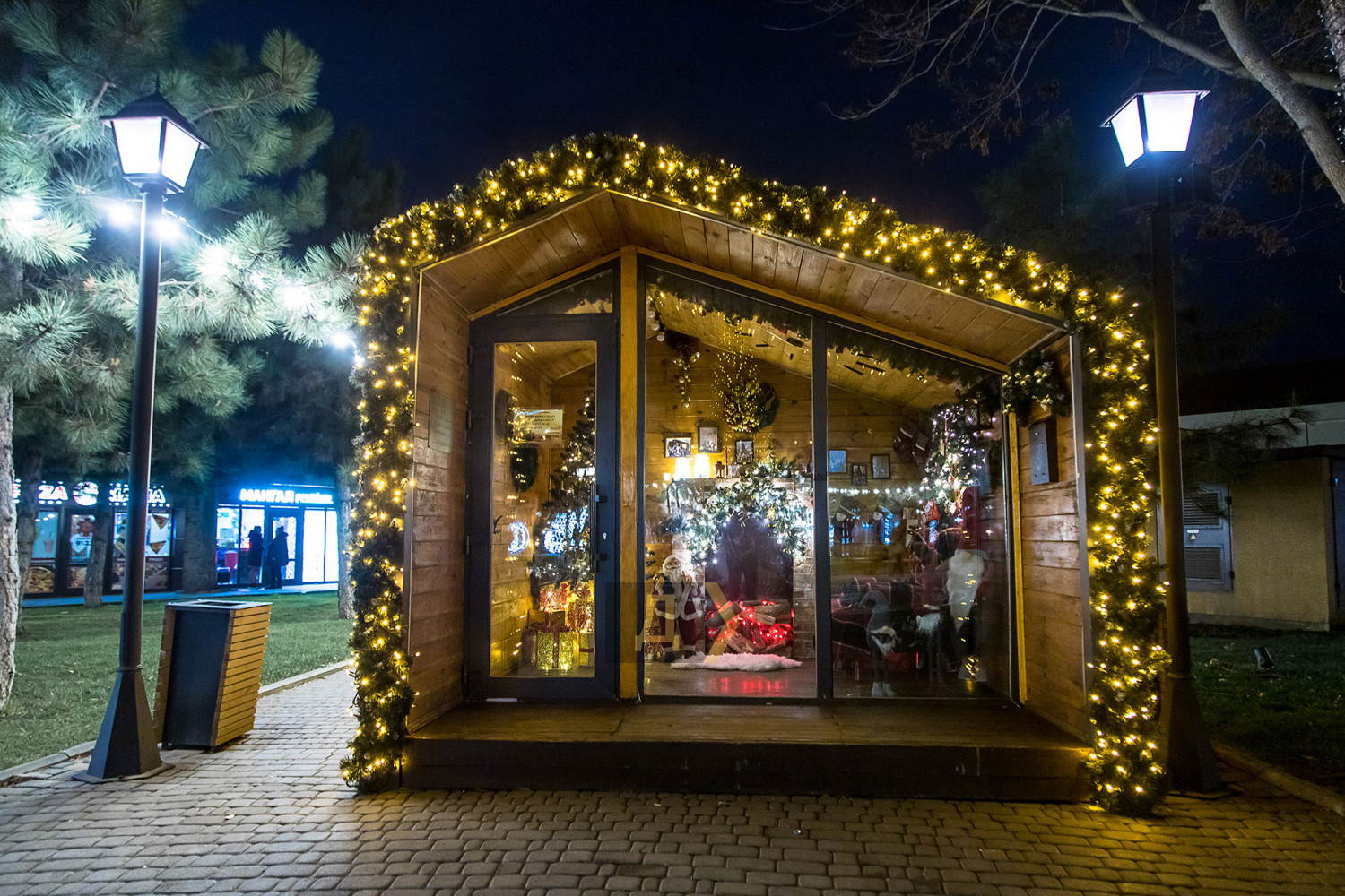 Небольшой деревянный домик, украшенный гирляндами, красуется возле фонтана, который с наступлением холодов традиционно превращается в постамент для новогодней елки.