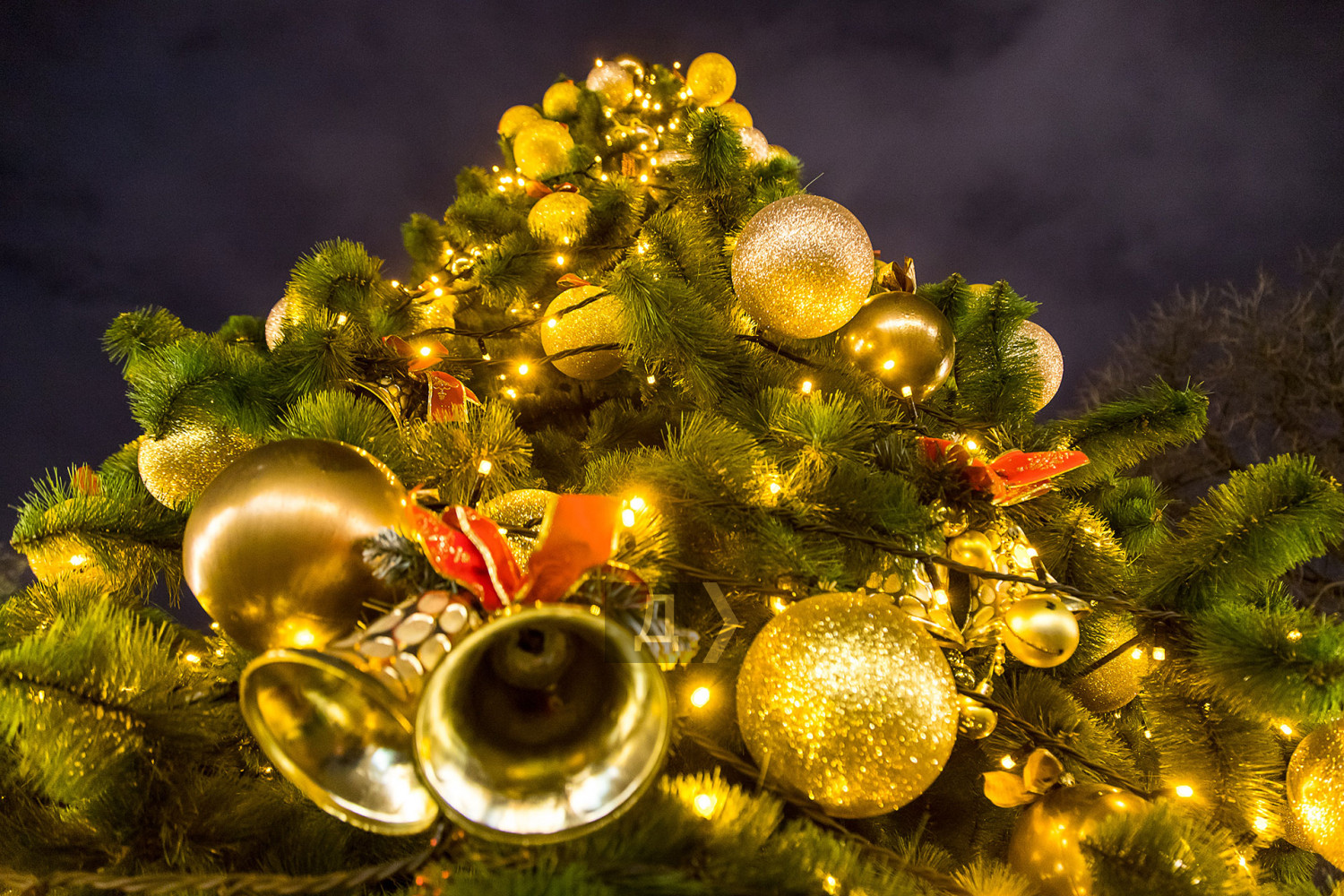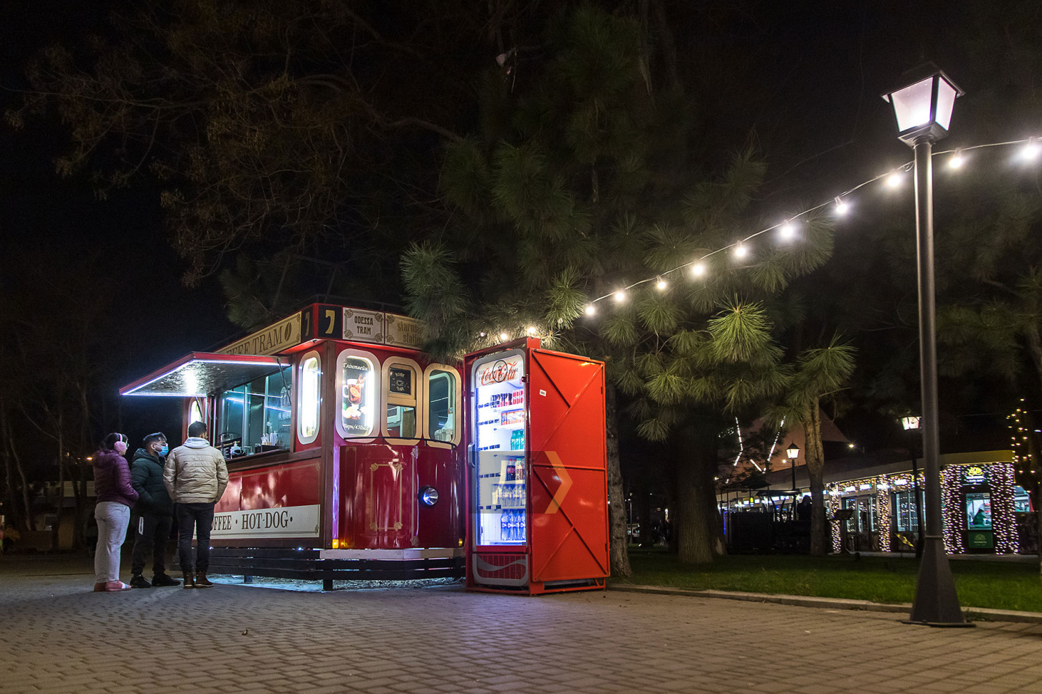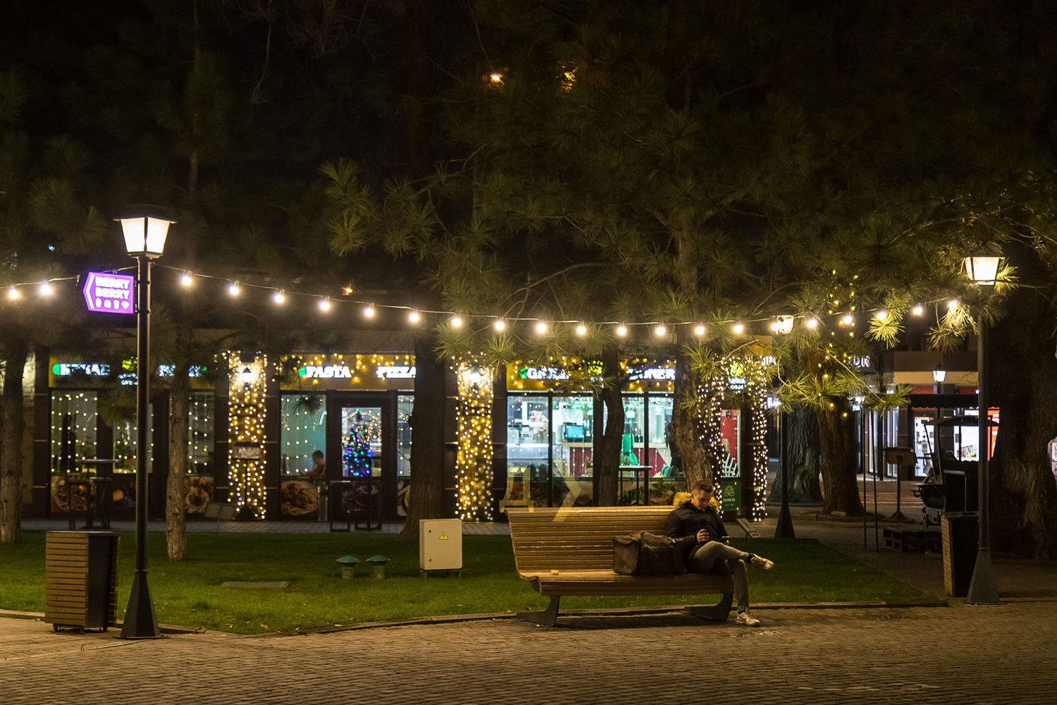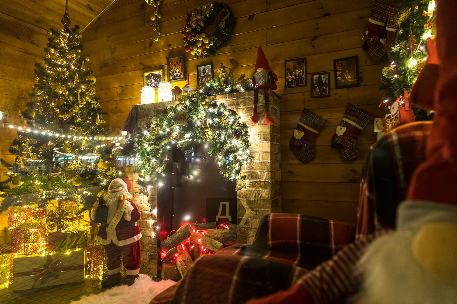 Небольшой деревянный домик, украшенный гирляндами, красуется возле фонтана, который с наступлением холодов традиционно превращается в постамент для новогодней елки.