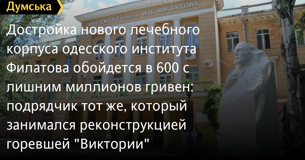 Достройка нового лечебного корпуса одесского института Филатова обойдется в 600 с лишним миллионов гривен: подрядчик тот же, который занимался реконструкцией горевшей «Виктории»Национальная академия медицинских наук Украины получит в 2021 году из государственного бюджета еще 302 миллиона гривен на завершение строительства нового лечебного корпуса Института глазных болезней и тканевой терапии имени В.П. Филатова. Об этом сообщила общественная организация «За прозрачные местные бюджеты». Всего НАМН выделили 5 миллиардов гривен на различные проекты. Напомним, корпус, который начали возводить еще в советское время, достраивают с 2017 года. Тендер тогда выиграла компания ООО «Юг-Укрстрой», которая получила из госбюджета 274,7 млн грн. В 2020-м с ней заключили договор на некие дополнительные работы стоимостью 69 млн грн. ООО «Юг-Укрстрой», принадлежащая Светлане Донченко, Любови и Юрию Резникову, была подрядчиком реконструкции детского лагеря «Виктория», произведенной с грубыми нарушениями. Один из построенных компанией деревянных корпусов сгорел в сентябре 2017. Тогда погибли три девочки. СМЕРТЬ РОССИЙСКИМ ОККУПАНТАМ! Заметили ошибку? Выделяйте слова с ошибкой и нажимайте control-enter |