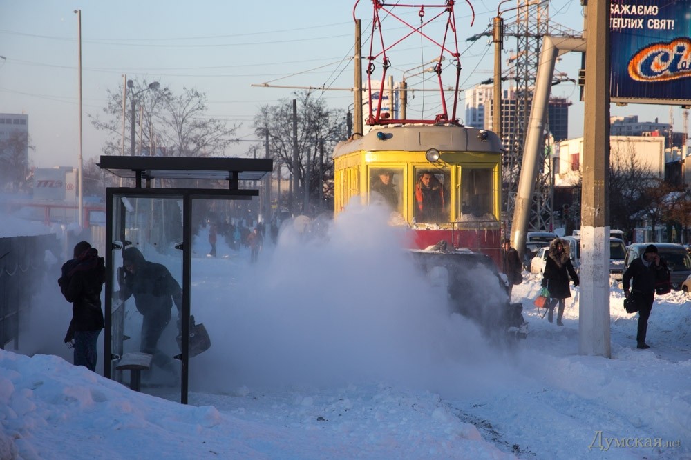 Сегодня супруг спросил у диспетчера трамваев на Старосенной площади, будут ли расчищены пути в Черноморку, и где их снегоуборочный трамвай с щётками. Ответ: трамвая нет, чистить нечем, ждите потепления.Так что, где пути засыпаны снегом, не надейтесь скоро увидеть трамвай.:(