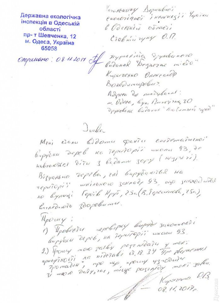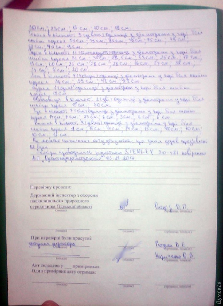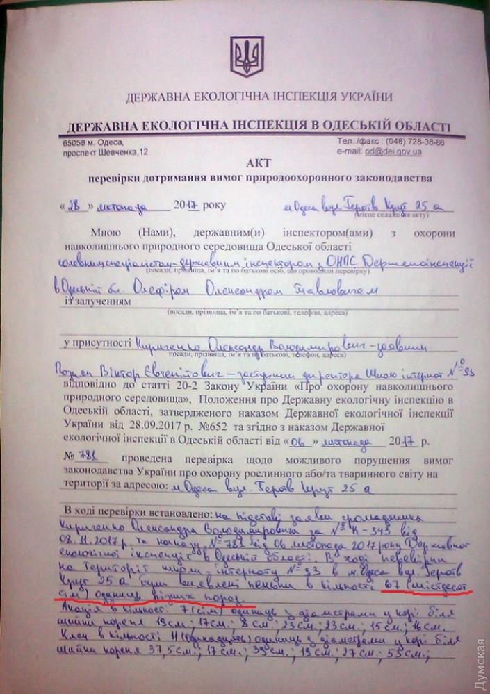 На территории одесского интерната для слабовидящих детей уничтожили 67 деревьев: директор говорит, что пеньки старые (документ, обновлено)На территории школы-интерната для слабовидящих детей №93 (ул. Героев Крут, 25а) были уничтожены 67 деревьев. О несанкционированном сносе зеленых насаждений стало известно после повторной инспекции, которую провели по настоянию активиста движения «Зеленый лист» Александра Кириченко. До этого представитель экологической инспекции насчитал всего четыре уничтоженных дерева. На месте проведения повторной инспекции не обошлось без инцидентов. По словам активиста, руководство учебного заведения всячески препятствовало повторному подсчету уничтоженных деревьев. «Пригласили инспектора экологической инспекции в кабинет директора, выгнали заявителя, ударили его дверью в лицо. Александр вызвал полицию», — рассказали в организации. ОБНОВЛЕНО. Директор интерната Юрий Семенюк утверждает, что «никто деревья не уничтожал». По его словам, пеньки, обнаруженные инспекторами, — старые. «Они давно уже. Почему вы не пишете, сколько мы новых деревьев посадили?» — возмущается руководитель. СМЕРТЬ РОСІЙСЬКИМ ОКУПАНТАМ! Помітили помилку? Виділяйте слова з помилкою та натискайте control-enter Новини по цій темі: 13 червня 2025: Суд відібрав Дюковський сад Одеси у фірми-«пустушки» і повернув місту: за боргами ніхто платити не буде 30 травня 2025: Корабель Землі: на одеській Трасі здоров'я з'явилася величезна дзеркальна куля від Михайла Реви (фото) |