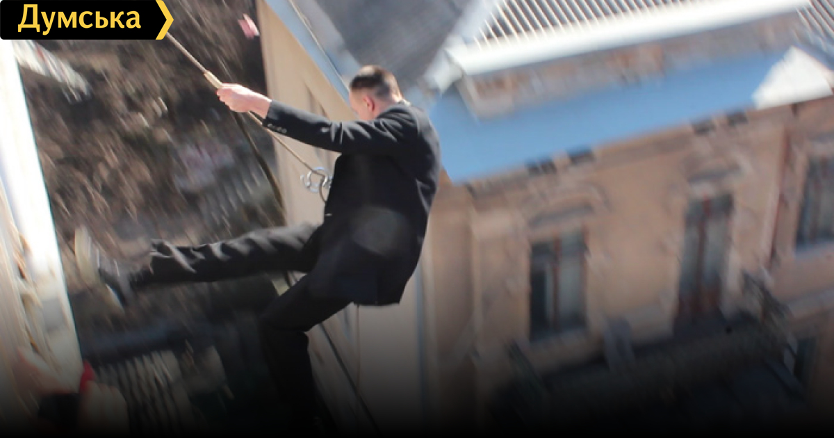 «а потом спускается на верёвке привлекая внимание всего города»… По веревке, предусмотрительно привязанной раньше. Прям, как знал, шо придется с Тещиного моста спускаться.