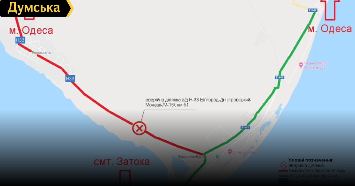 На трассе Одесса-Белгод-Днестровский-Монаши образовались провалы: машины направляют в объездВ Службе автомобильных дорог Одесской области сообщили о частичном подмывании грунта и образовании провалов на 51 км трассы Н-33 Одесса — Белгород-Днестровский — Монаши — / М-15 / подъезд к порту Черноморск. Из-за ЧП с 14:00 на этой дороге вводится временное ограничение движения всех транспортных средств. «Для обеспечения безопасных и непрерывных условий передвижения участников дорожного движения и проведения аварийно-восстановительных работ Службой автомобильных дорог в Одесской области на данном участке автодороги вводится временное ограничение движения с объездом автотранспорта по автомобильной дороге /Н 33 / - Каролино-Бугаз — Грибовка — Санжейка — / М-27 /», - сообщили в ведомстве. СМЕРТЬ РОСІЙСЬКИМ ОКУПАНТАМ! Помітили помилку? Виділяйте слова з помилкою та натискайте control-enter |