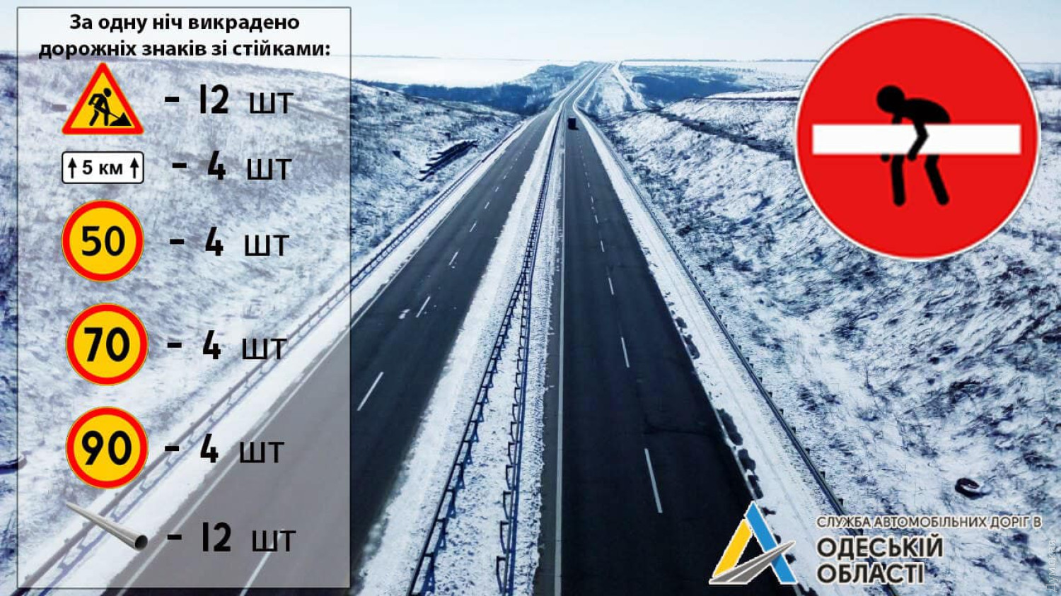 28 дорожніх знаків і 12 стійок до них викрали невідомі біля села Знам'янка на Київській трасі в Одеській області.