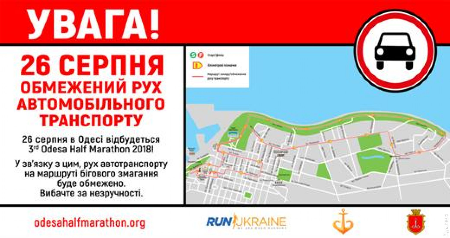 Движение транспорта в центральной части города перекроют в воскресенье, 26 августа, и частично в субботу, 25 августа, из-за международного полумарафона «3rd Odesa Half Marathon».