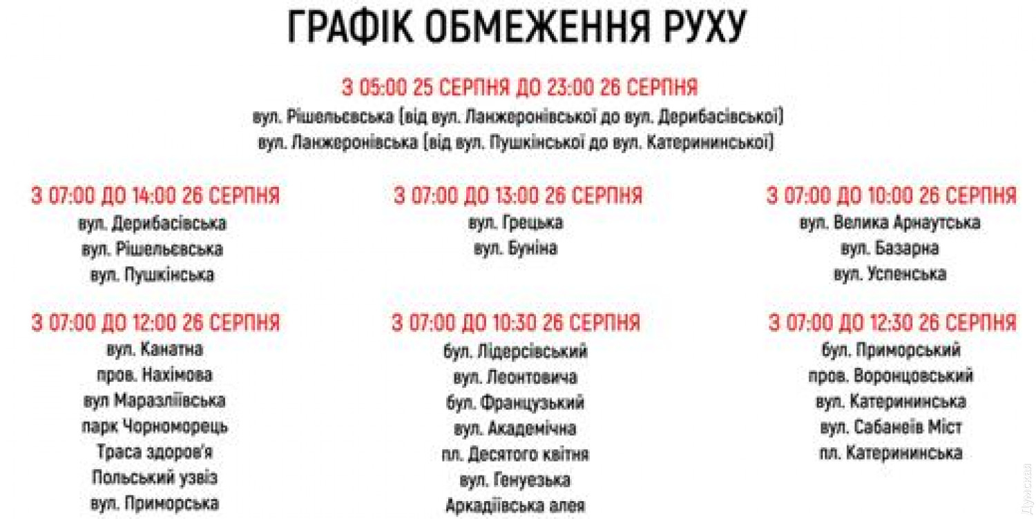 В субботу, 25 августа, с 05:00 и до 23:00 26 августа будет перекрыта для движения транспорта Ришельевская улица (от Ланжероновской до Дерибасовской) и Ланжероновская улица (от Пушкинской до Екатерининской), где будет проходить подготовка к полумарафону.